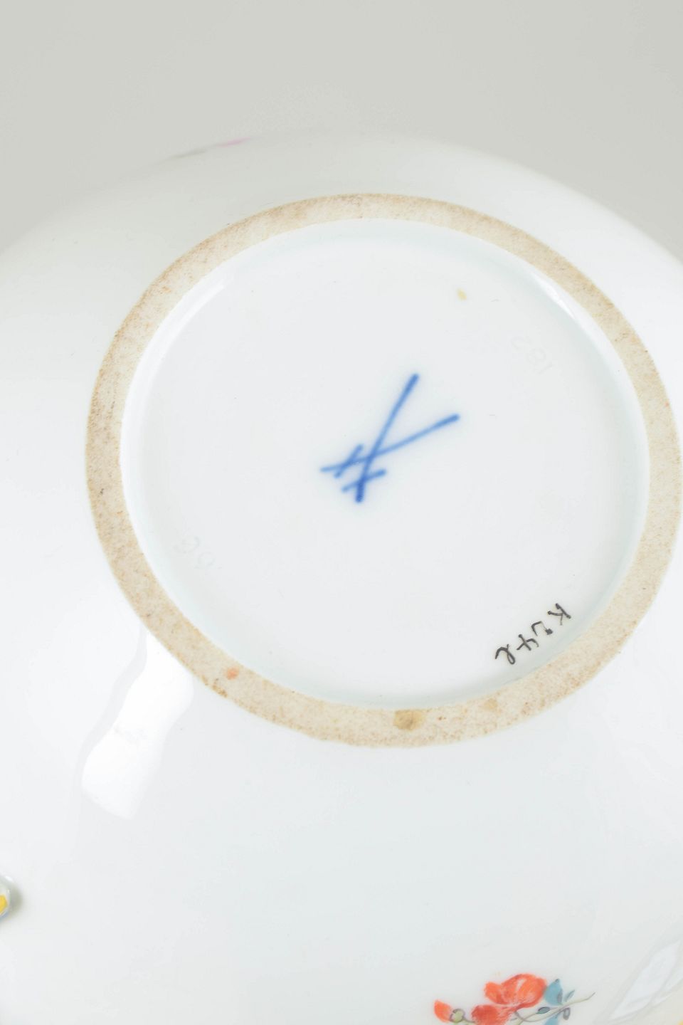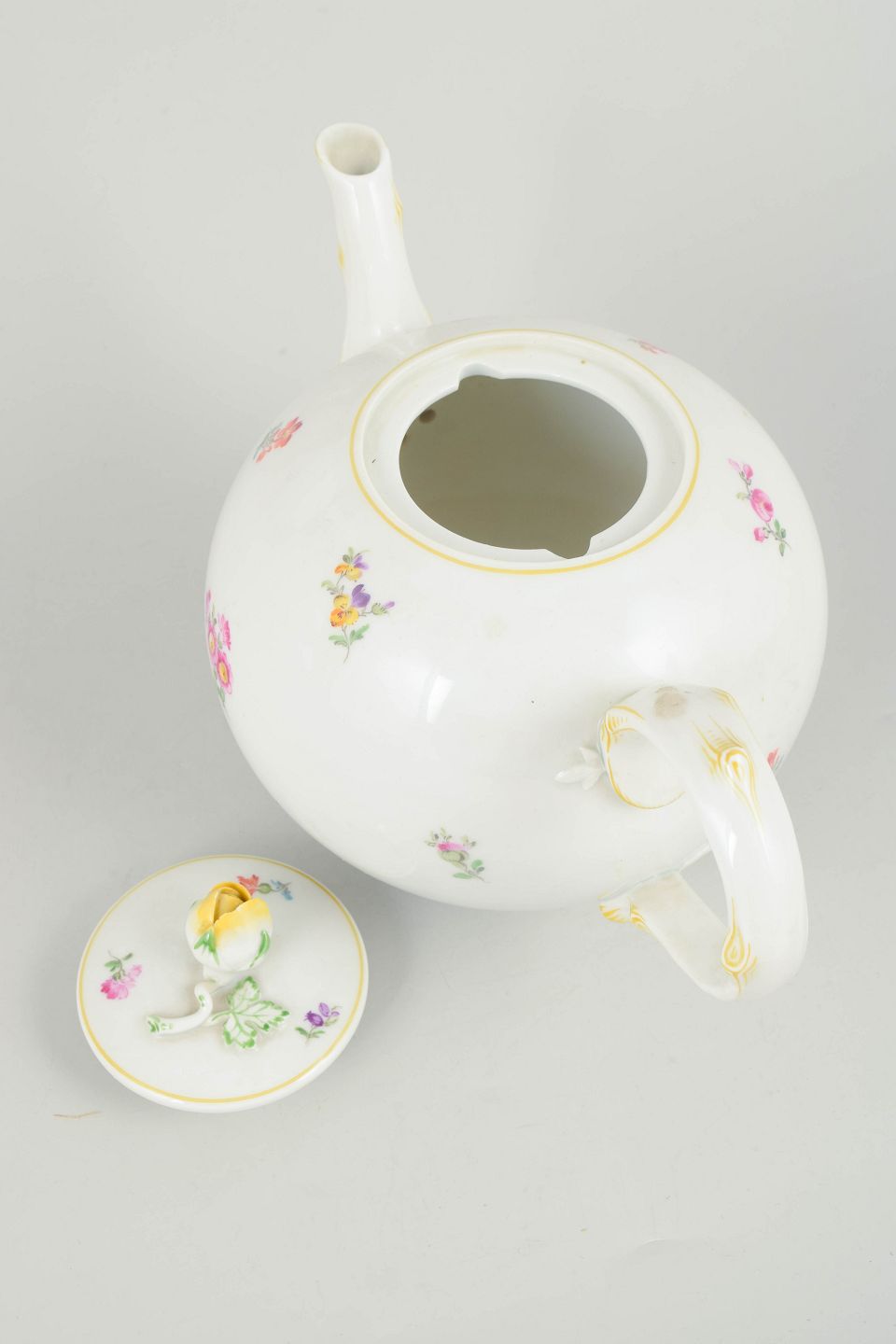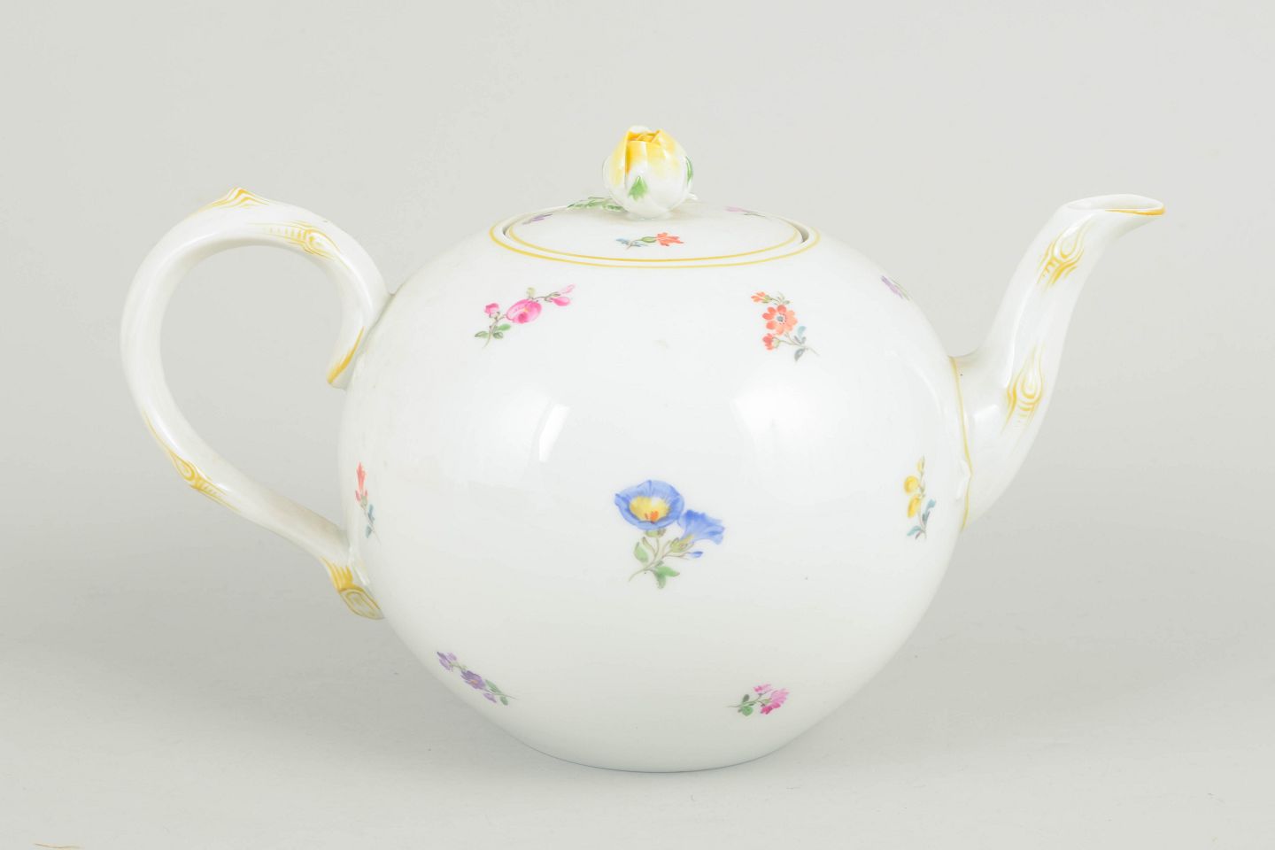 Meissen, tekande med polykrom blomsterdekoration.Tekande i porcelæn håndmalet med polykrome blomster og dekoreret med guldkant. Rund korpus med svungen tud og elegant hank samt låg med knop, udført i klassisk Meissen stil fra midten af det 20. århundrede. Undersiden mærket med Meissen krydssværd, første sortering.