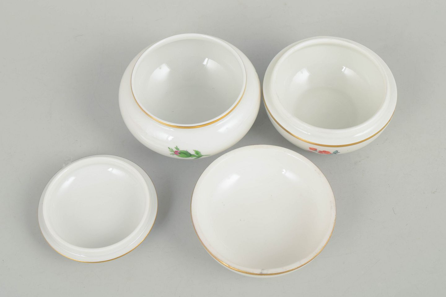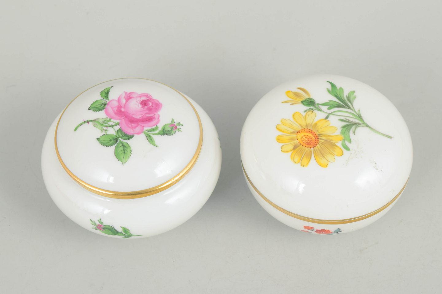 Meissen, to lågkrukker med polykrom blomsterdekoration.Sæt af to lågkrukker i porcelæn håndmalet med polykrome blomster og dekoreret med guldkant. Klassiske Meissen former fra midten af det 20. århundrede med fint tilpassede låg og elegant afrundet profil. Begge mærket med Meissen krydssværd.