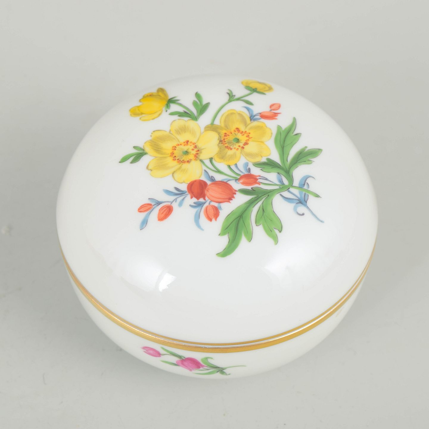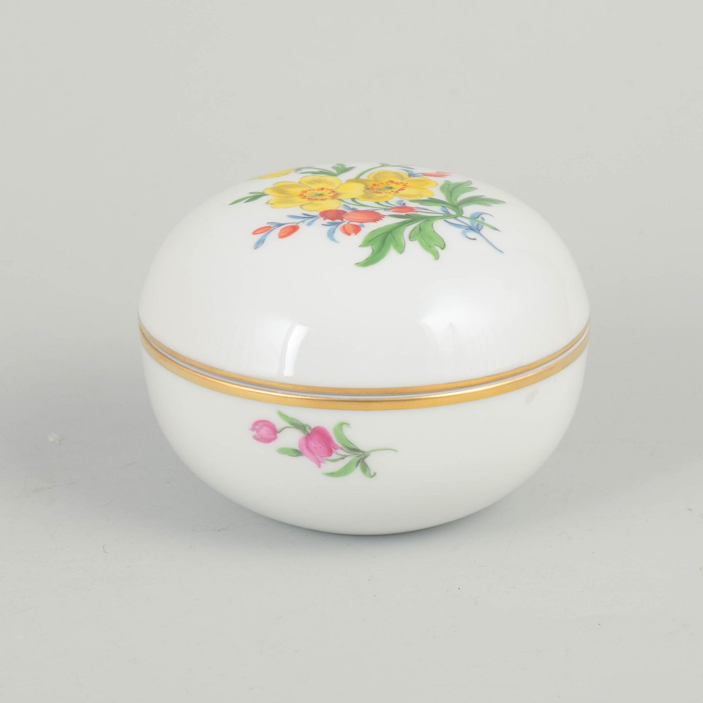 Meissen, lågkrukke med polykrom blomsterdekoration.Lågkrukke i porcelæn håndmalet med polykrome blomster og dekoreret med guldkant. Harmonisk rund form med fint tilpasset låg og klassisk Meissen dekoration fra midten af det 20. århundrede. Undersiden mærket med Meissen krydssværd, første sortering.