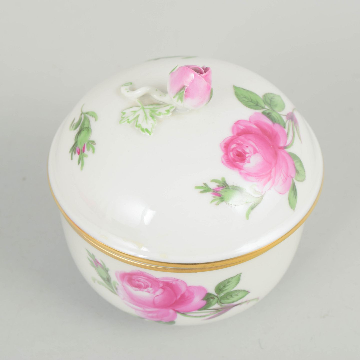 Meissen, sukkerskål med låg og polykrom blomsterdekoration.Sukkerskål i porcelæn med låg, håndmalet med polykrome blomster og guldkant. Dekoreret med større rosenmotiver og knopformet låggreb i klassisk Meissen stil fra midten af det 20. århundrede. Undersiden mærket med Meissen krydssværd.