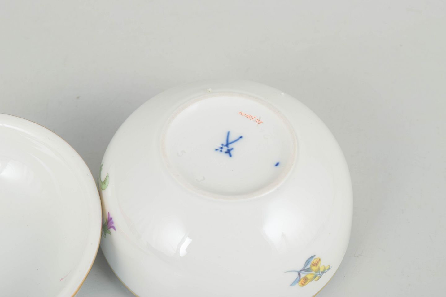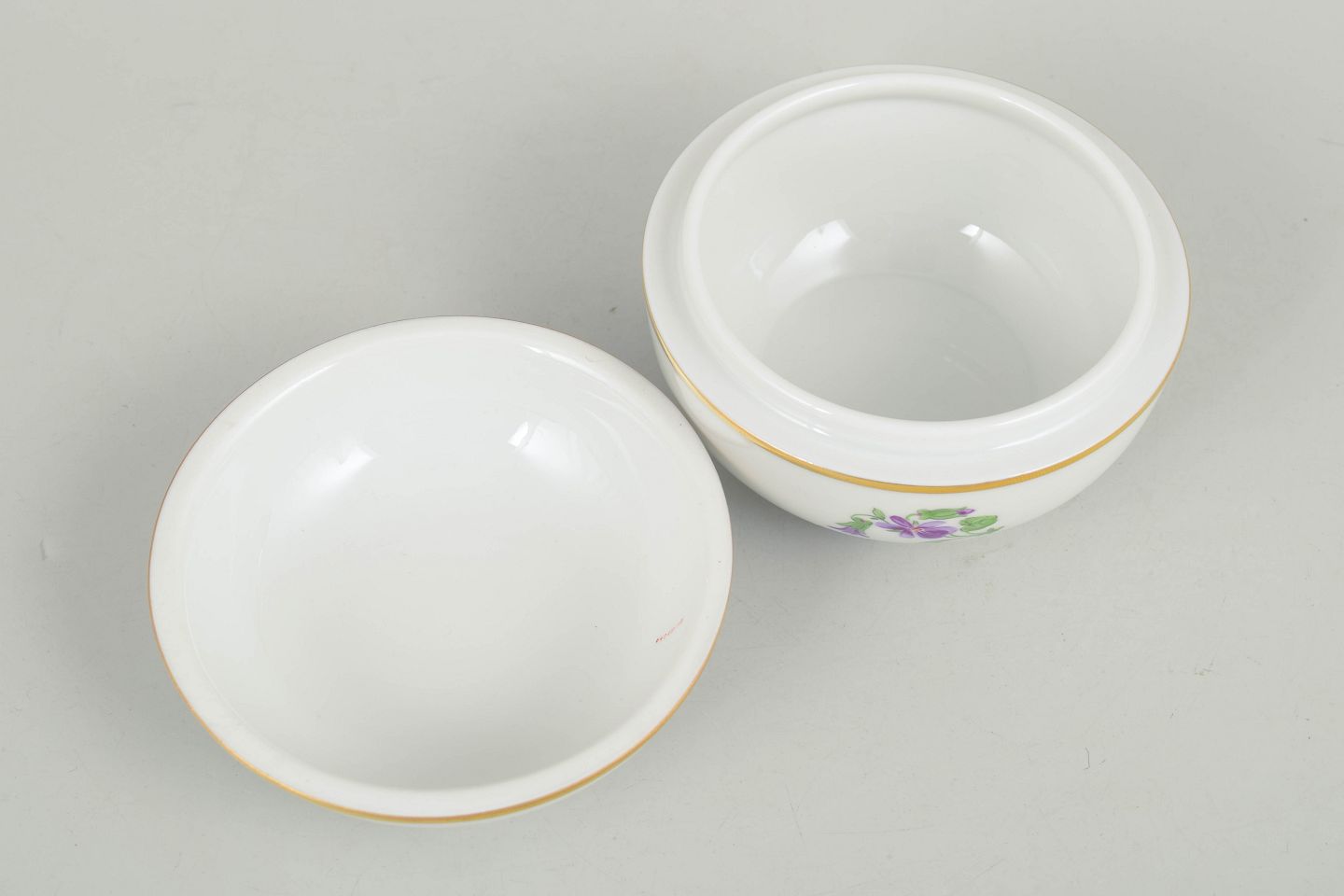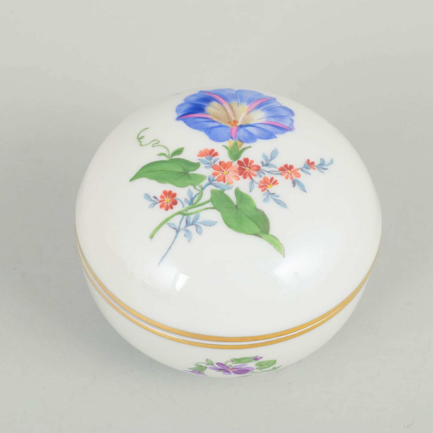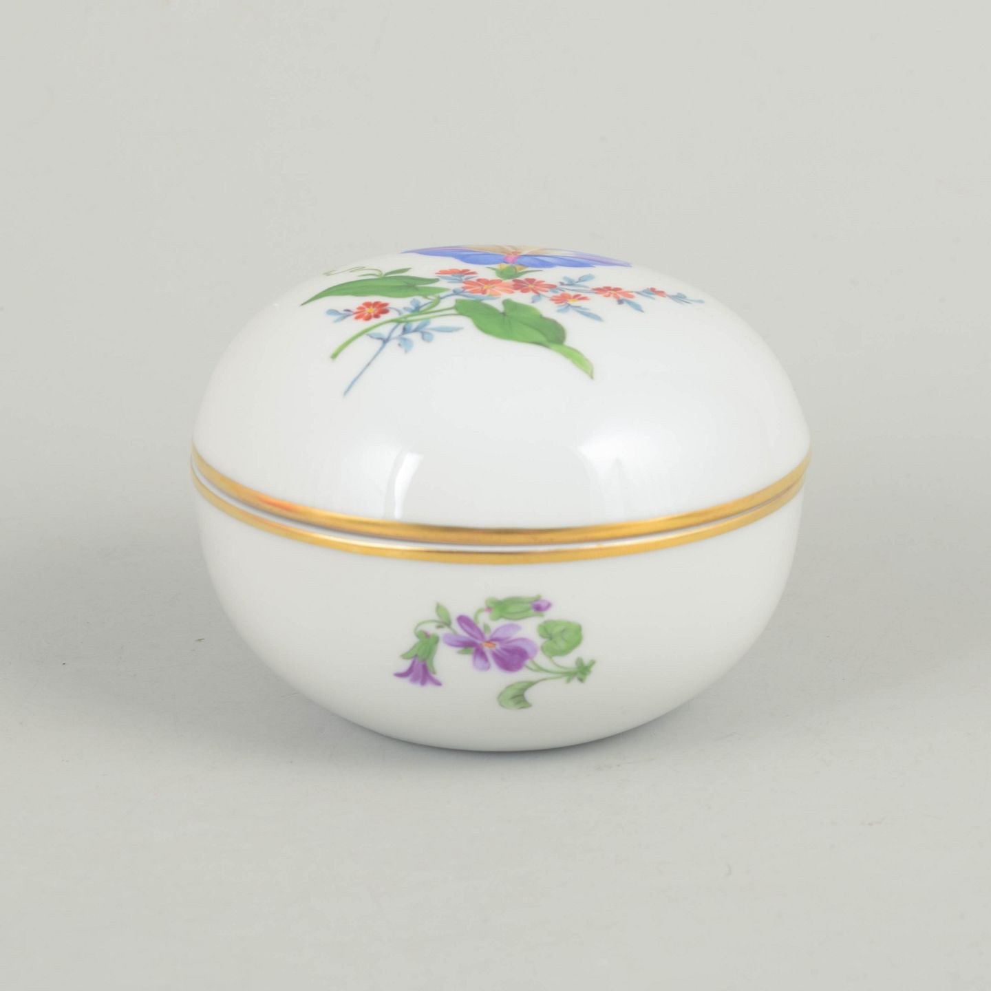 Meissen, lågkrukke med polykrom blomsterdekoration.Rund lågkrukke i porcelæn håndmalet med polykrome blomster og dekoreret med guldkant. Klassisk Meissen udførelse fra midten af det 20. århundrede med fint afstemt låg og elegant, enkel form. Undersiden mærket med Meissen krydssværd. 3. sortering.