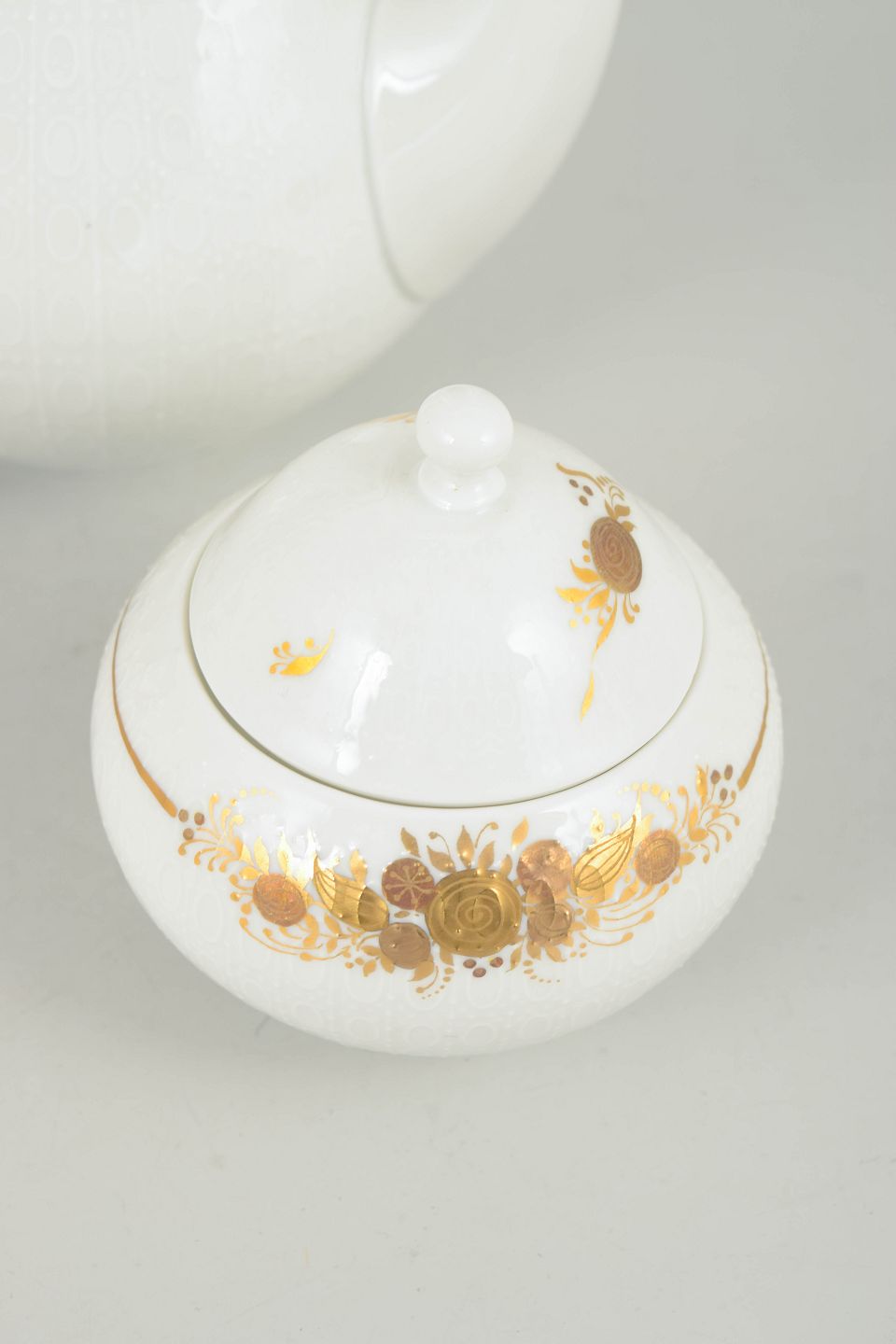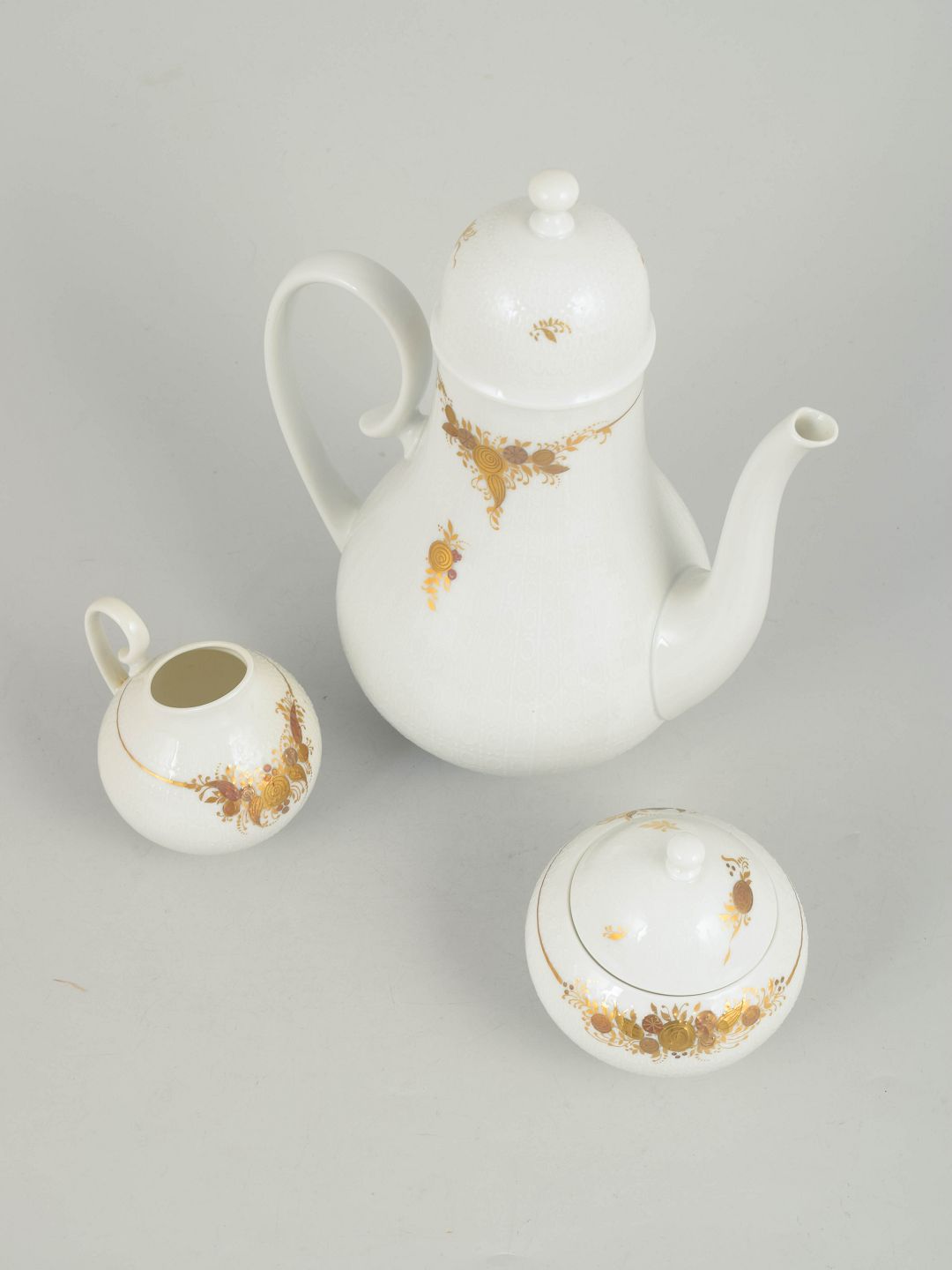 Bjørn Wiinblad for Rosenthal, kaffesæt med kaffekande, flødekande og sukkerskål.Elegant kaffesæt i porcelæn bestående af kaffekande, flødekande og sukkerskål med låg, dekoreret med det karakteristiske blomsterornament fra Romanze-serien. Den fine dekoration i gyldne nuancer fremstår med et romantisk og dekorativt udtryk, typisk for Wiinblads formsprog i 1970’erne.