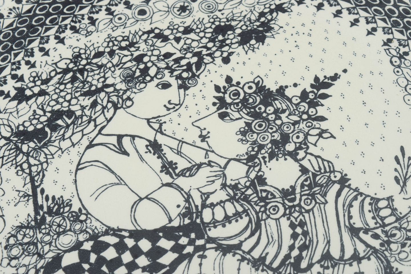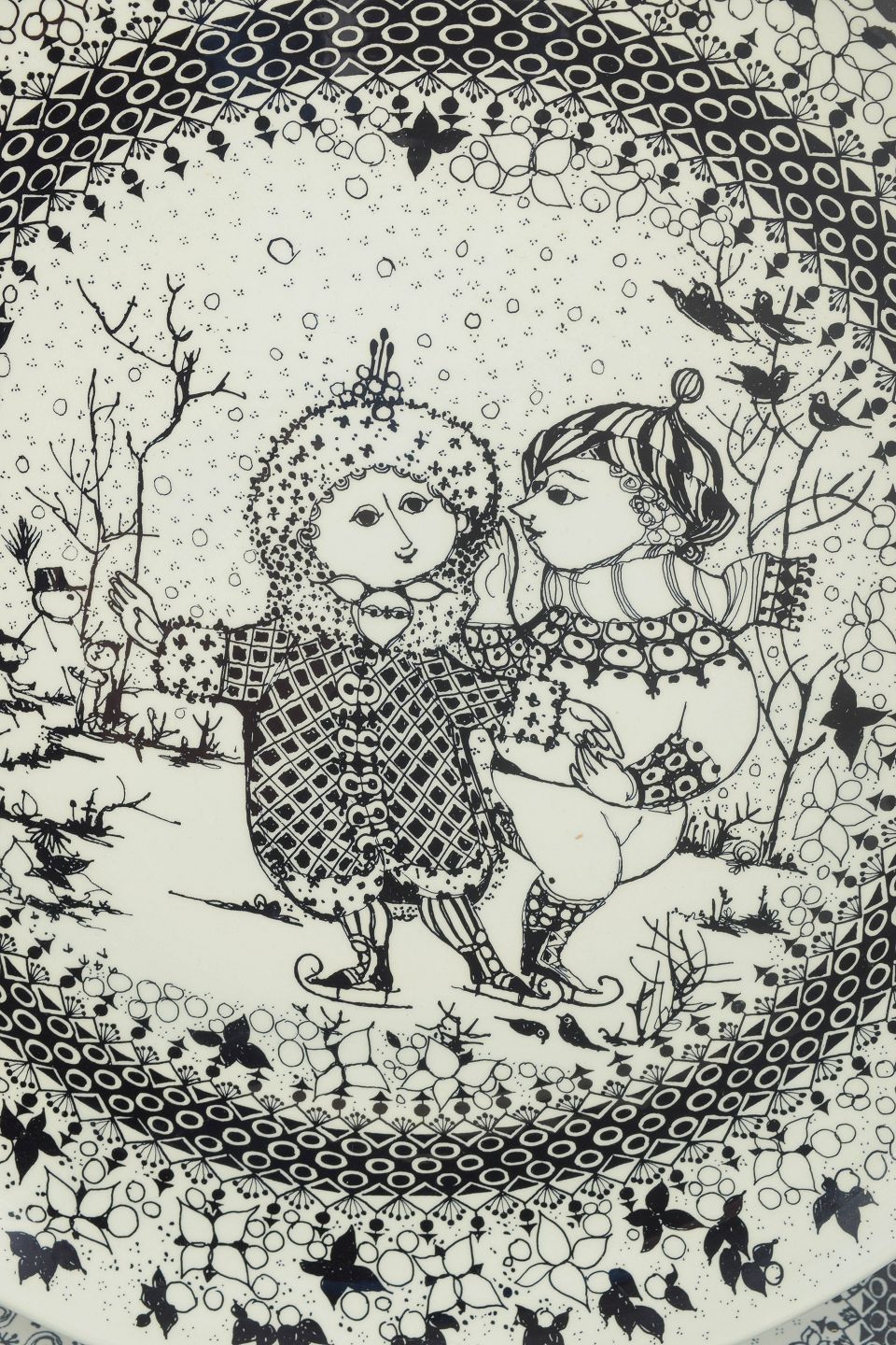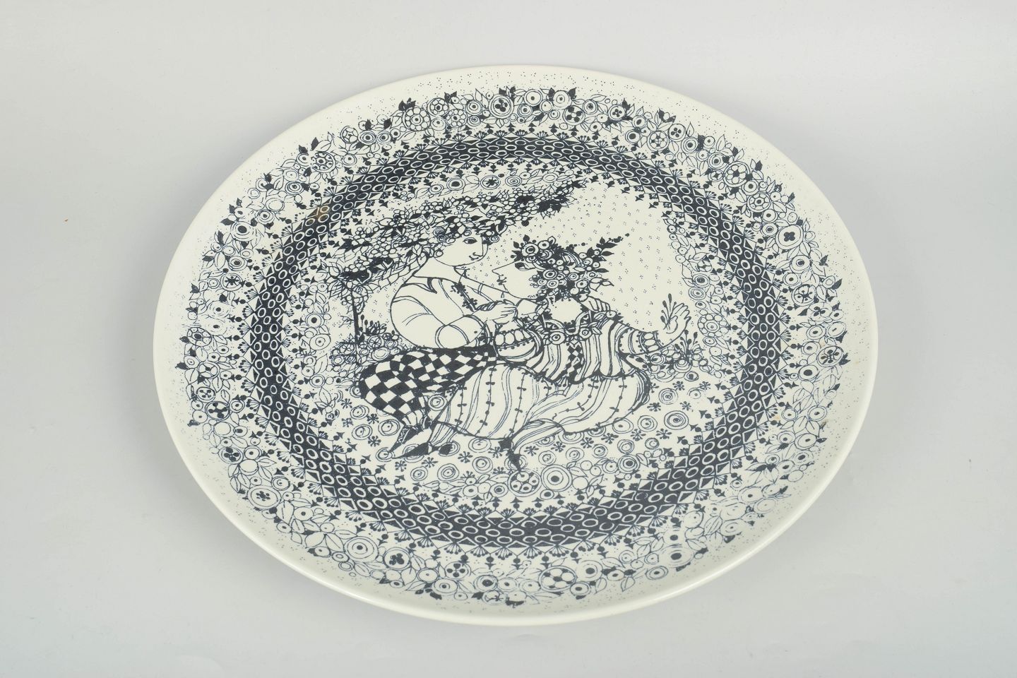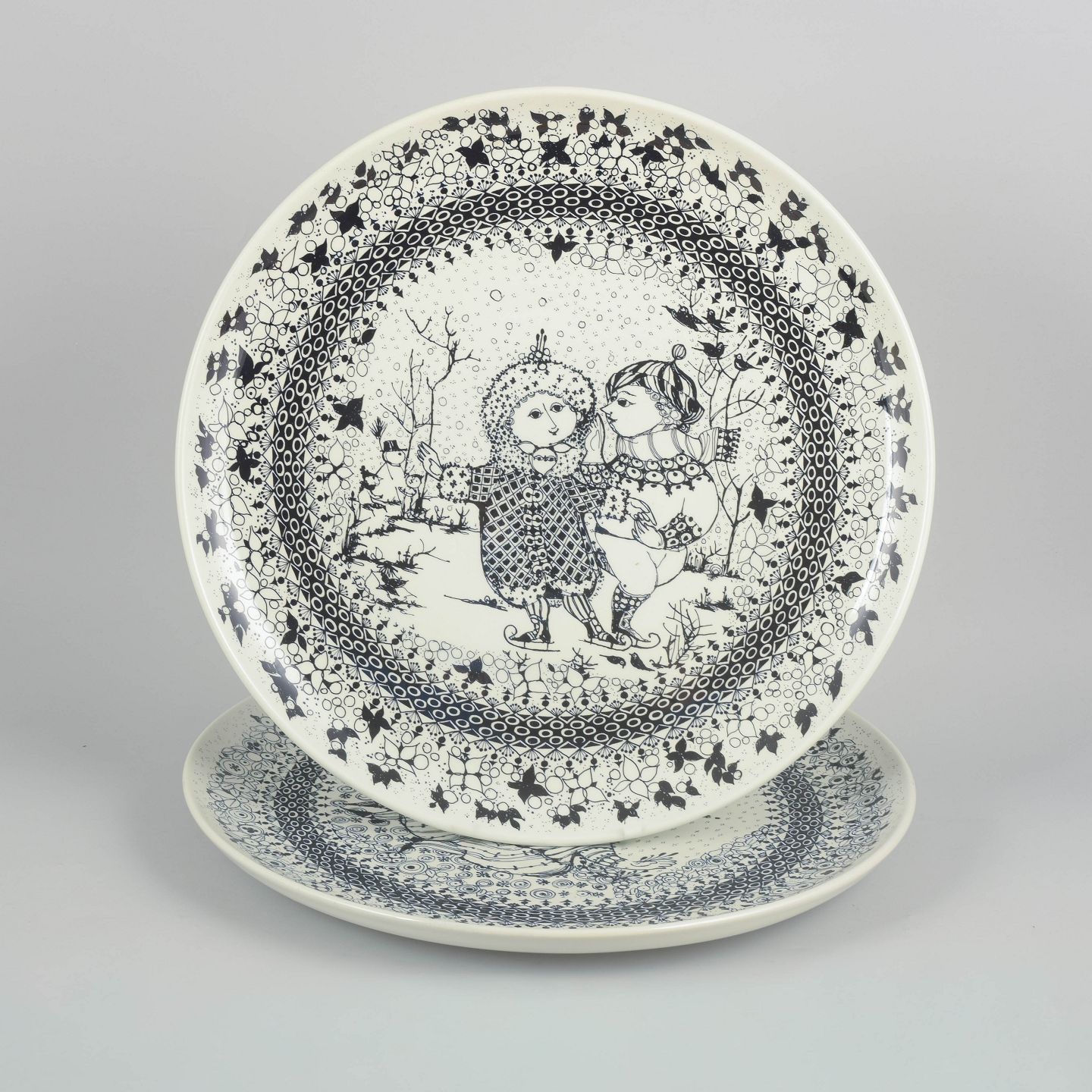 Bjørn Wiinblad for Nymølle, to store fajancefade “Årstiderne” vinter og forår.Dekorative runde fade i fajance med sort stregdekoration i Bjørn Wiinblads karakteristiske eventyrlige stil, med figurmotiver og ornamentale borter. Motiverne repræsenterer årstiderne vinter og forår.
