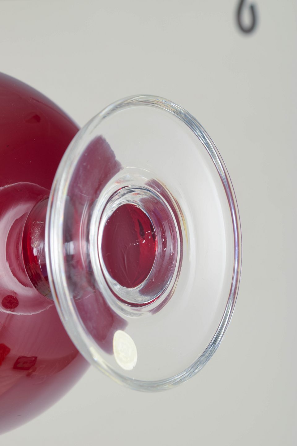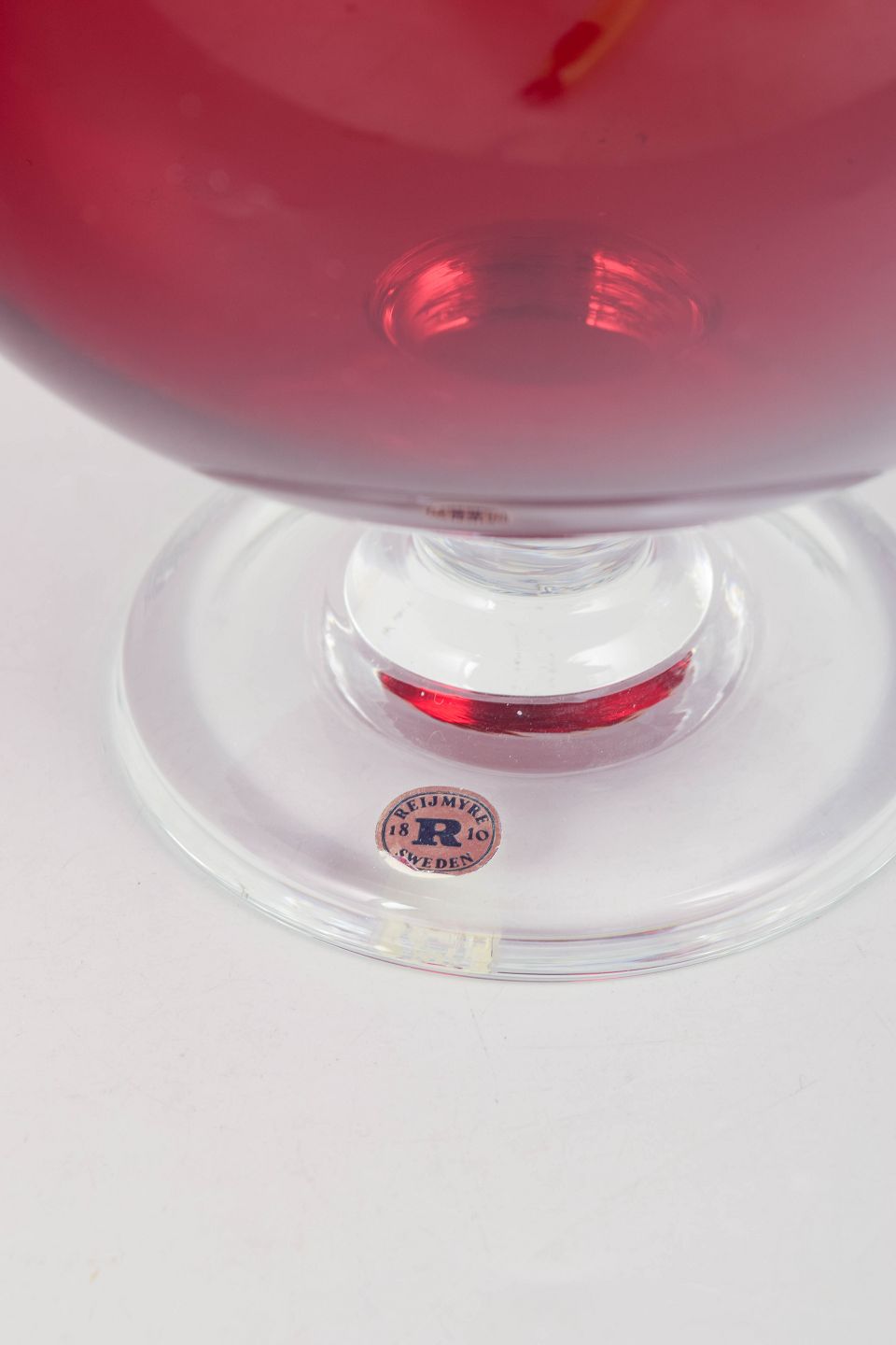 Reijmyre, stor pokalformet glas.Mundblæst glas i klar og rød farvetone med rund kumme og kort stilk på bred fod. Original mærkat fra Reijmyre Glasbruk bevaret.