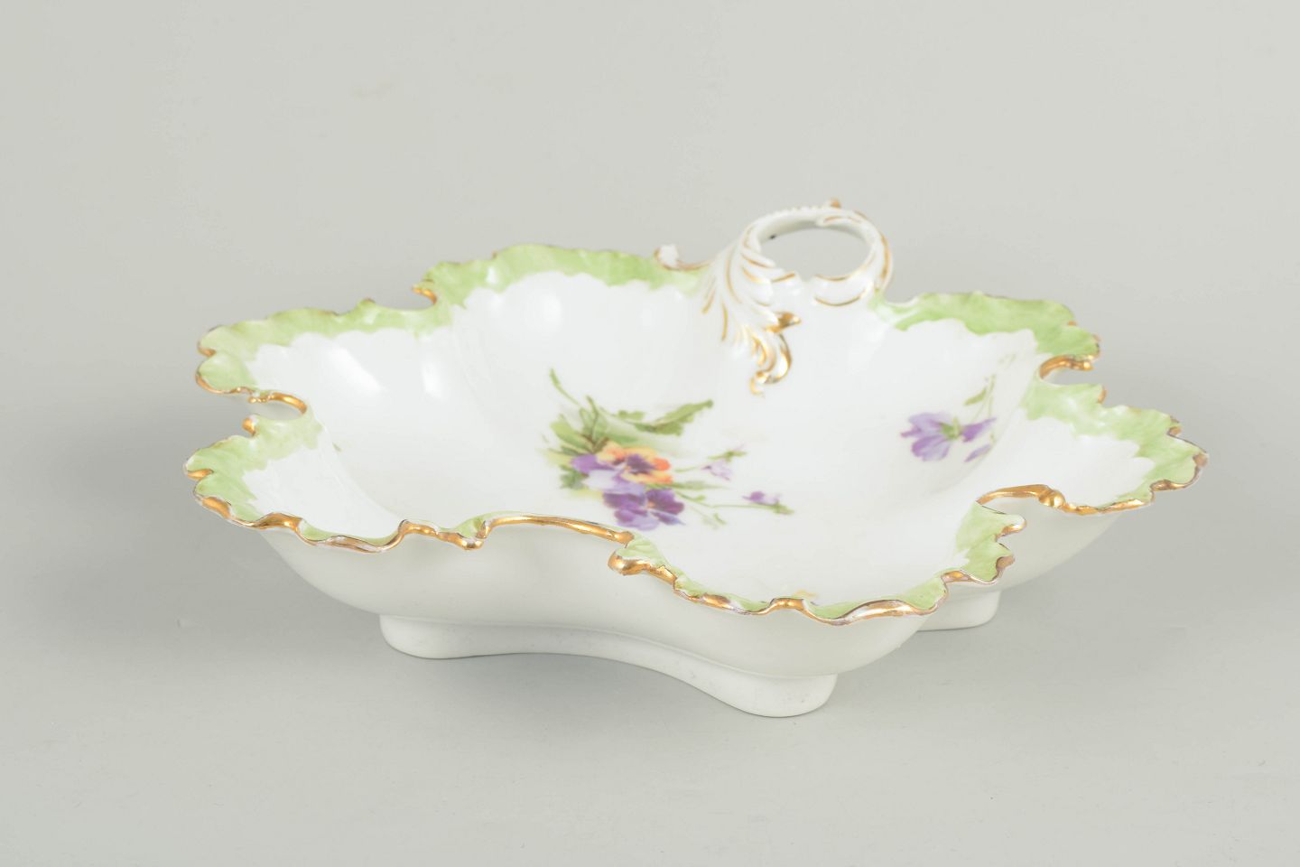 Rosenthal, skål med guldbemaling og blomsterdekoration.Dekorativ skål i porcelæn med bølget kant og gennembrudt greb, udsmykket med håndmalede blomster i lilla og grønne nuancer samt forgyldte detaljer, typisk for Rosenthals produktion i begyndelsen af det 20. århundrede.