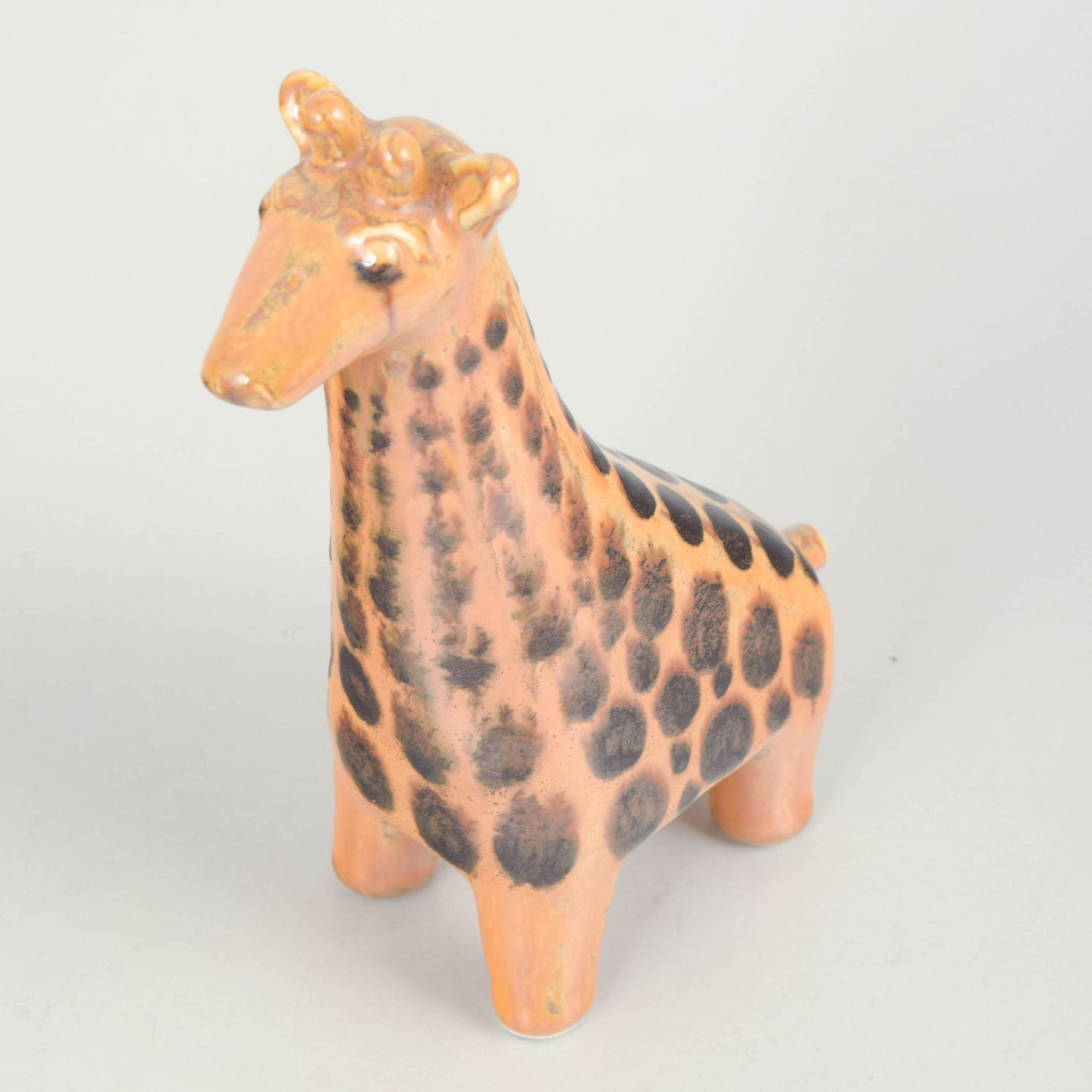 Brita Mellander-Jungermann for Karlskrona, giraffe figure.Decorative ceramic figure shaped as a giraffe with a stylised form and hand-painted dark spots on a warm orange glaze. A characteristic example of Swedish design from the period.