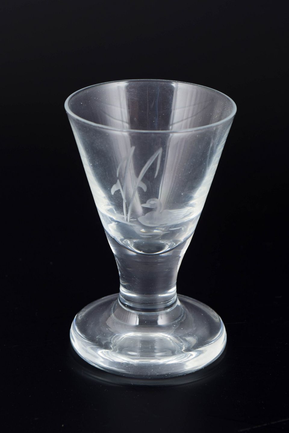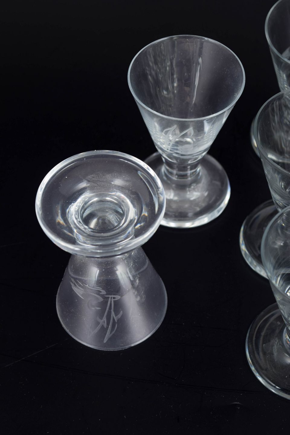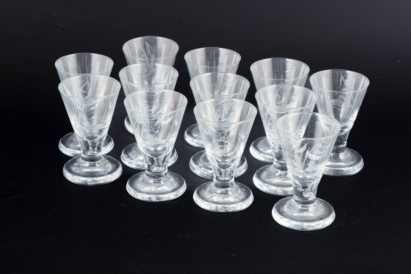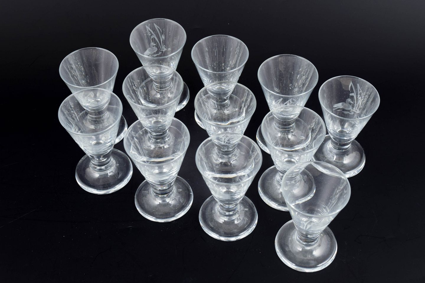 Skandinavisk glasværk, sæt af tolv snaps glas med ande- og sivmotiv.Mundblæste snaps glas med slebet dekoration af ænder og siv i klart glas, udført i klassisk mellemkrigstidsstil med konisk kumme og massiv fod.