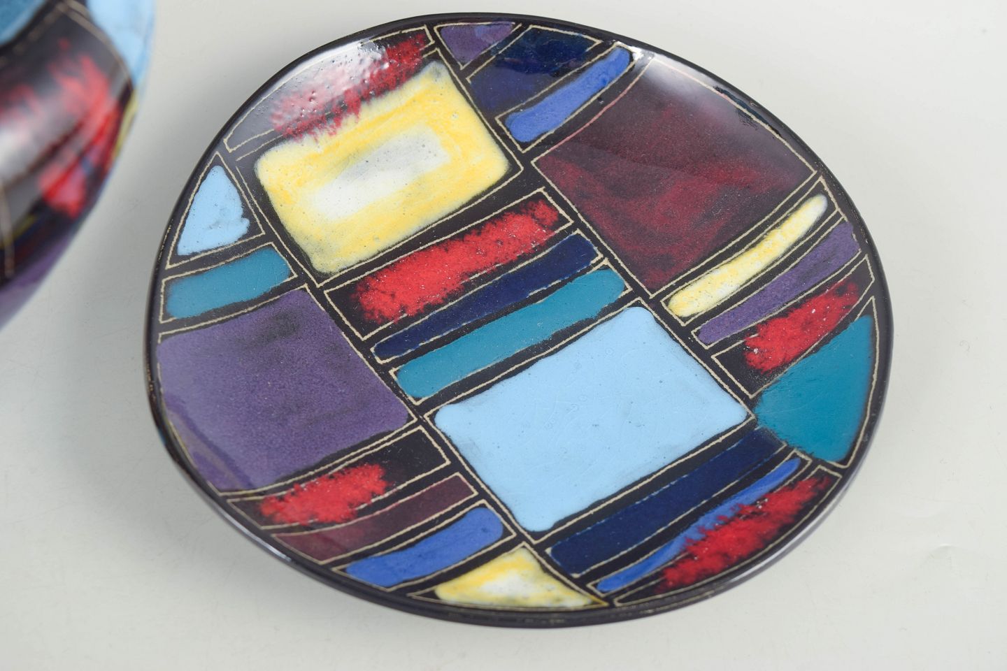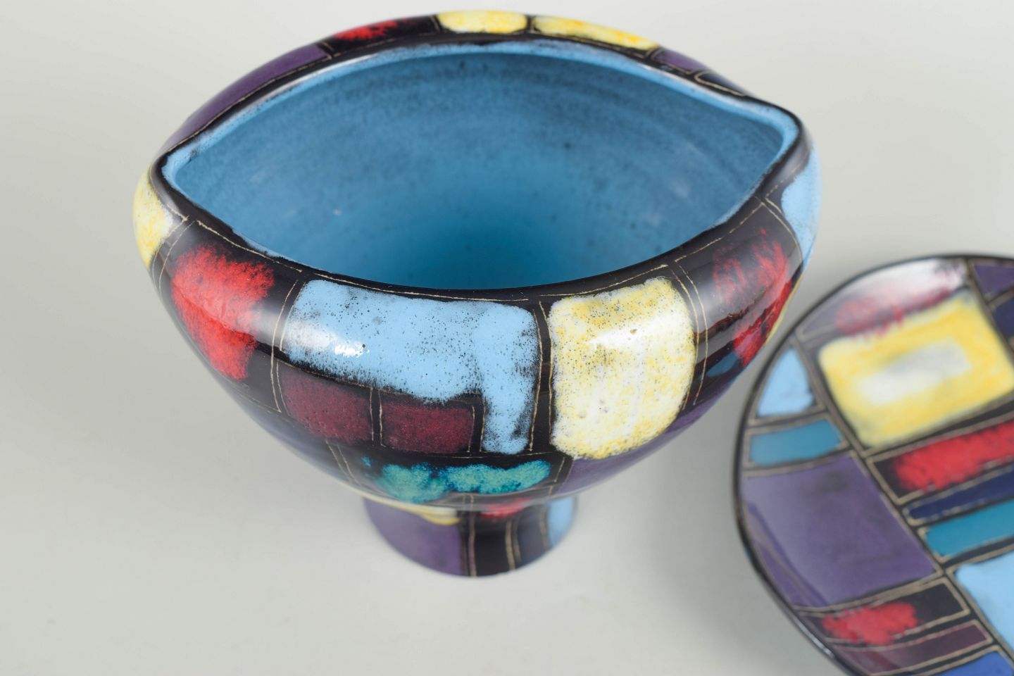 Dekorativ keramisk vase med integreret fod og tilhørende underfad, udført i flerfarvet glasur med abstrakte felter i blå, røde, gule og violette nuancer. Et karakteristisk eksempel på tysk kunstkeramik fra midten af det 20. århundrede.