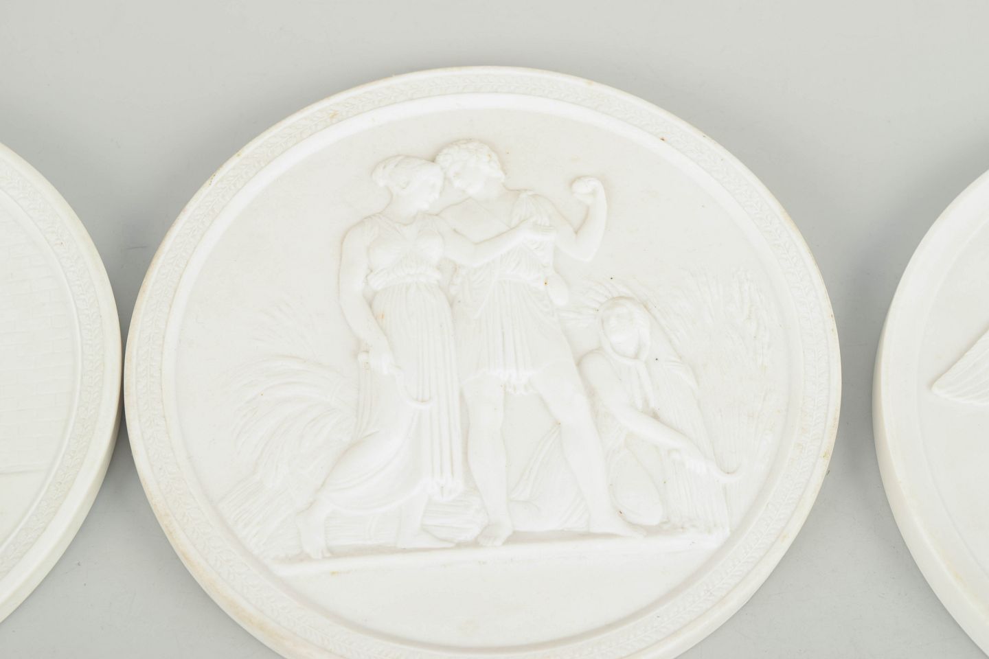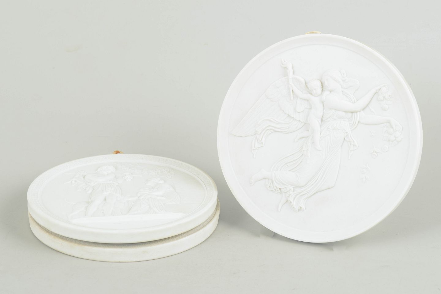 Relieffer i hvidt uglaseret porcelæn med klassiske motiver efter Bertel Thorvaldsen, udført i fin biscuit med detaljeret figurdekoration og ophæng på bagsiden. Første sortering.