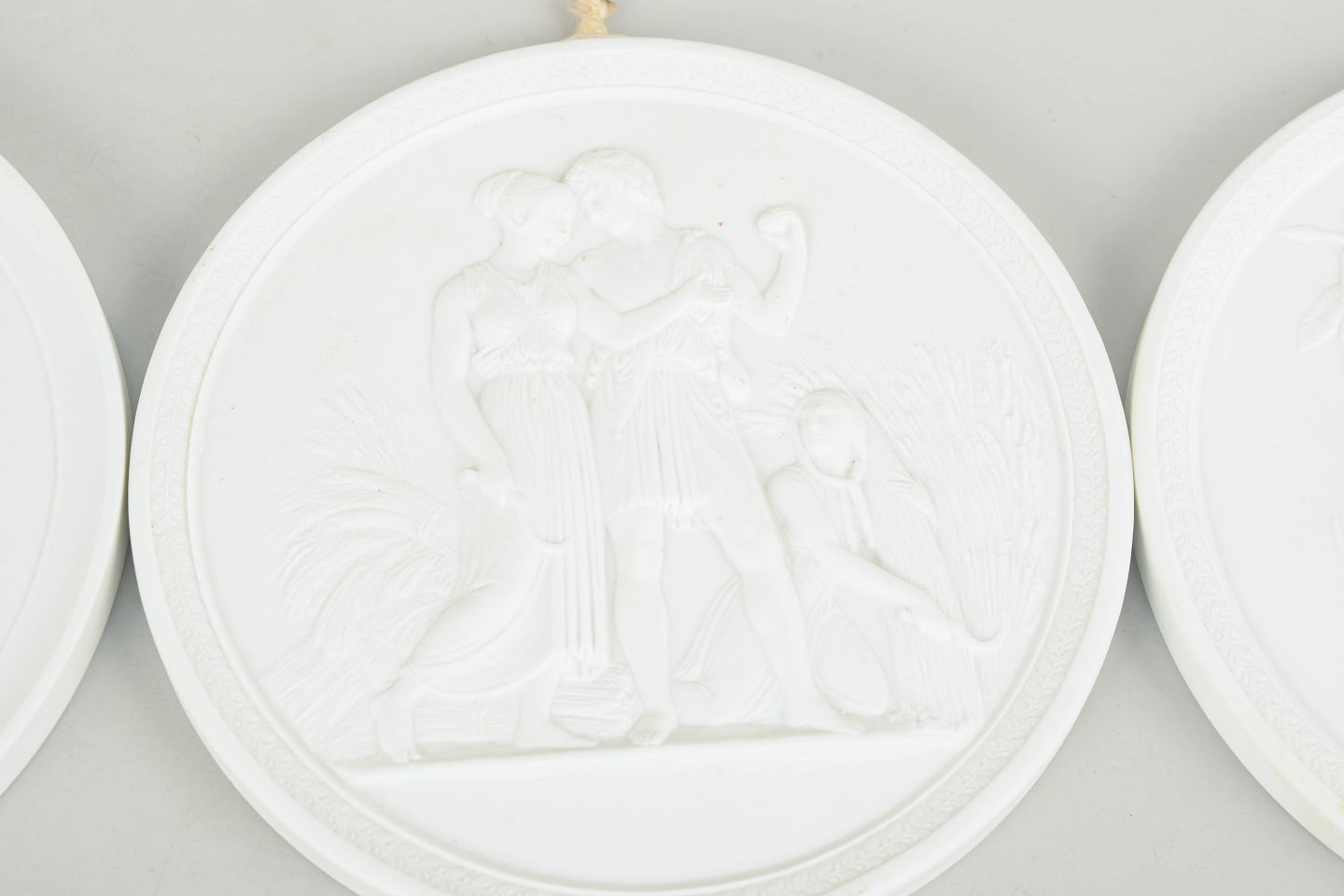 Royal Copenhagen, sæt af fire biscuit vægrelieffer efter Thorvaldsen.Relieffer i hvidt uglaseret porcelæn med klassiske motiver efter Bertel Thorvaldsen, udført i fin biscuit med detaljeret figurdekoration og ophæng på bagsiden. Første og tredje sortering.