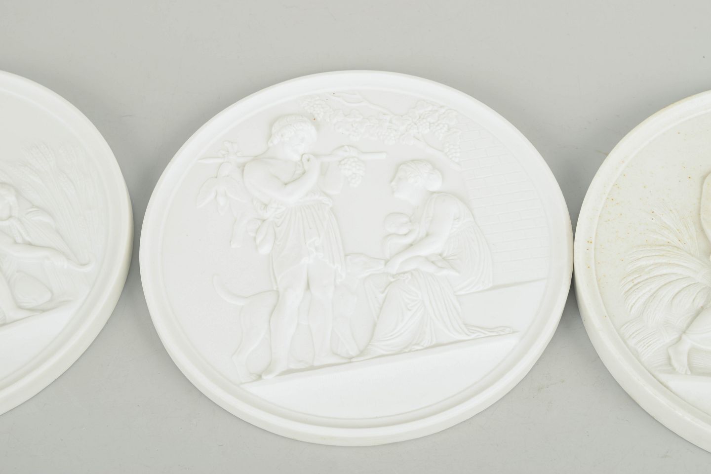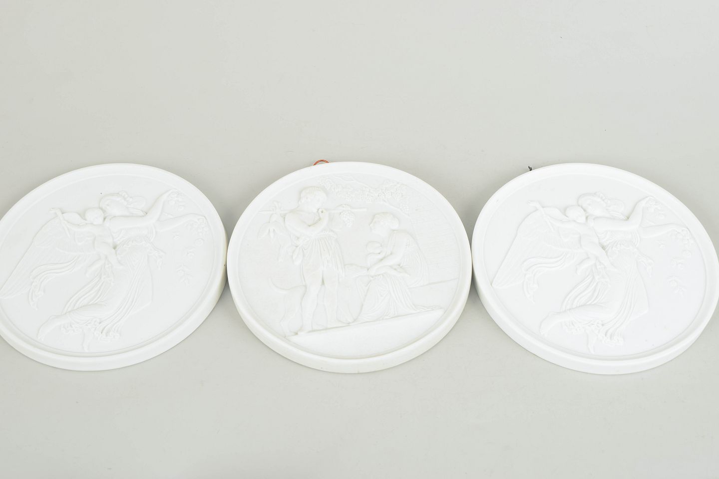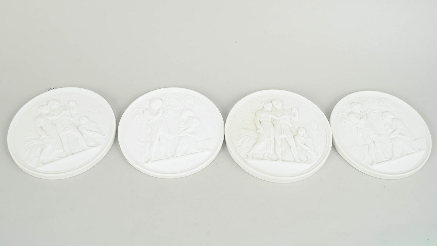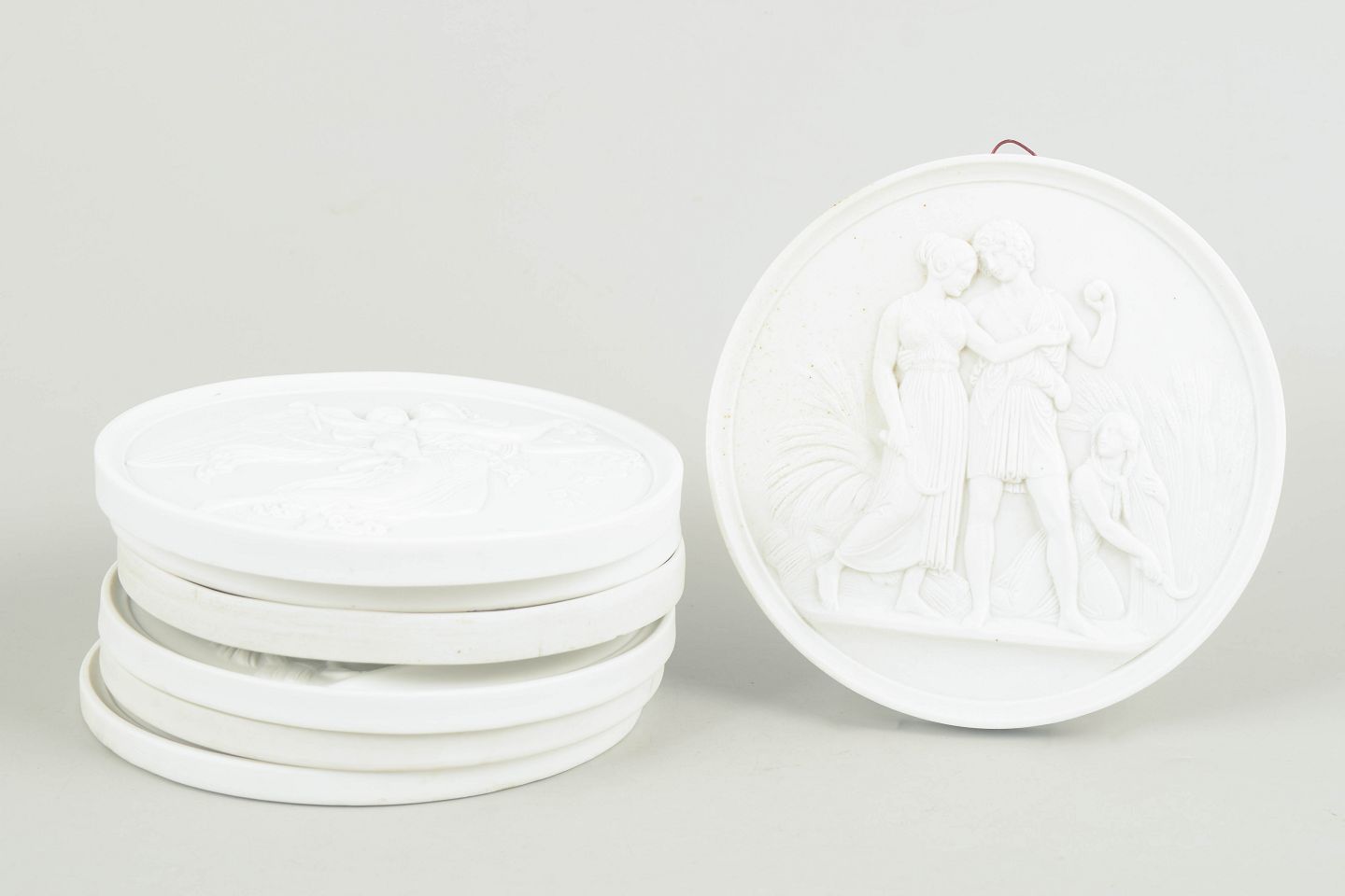 Bing & Grøndahl, sæt af syv biscuit vægrelieffer efter Thorvaldsen.Relieffer i hvidt uglaseret porcelæn med klassiske motiver efter Bertel Thorvaldsen, udført i fin biscuit med detaljeret figurdekoration og ophæng på bagsiden. Første sortering.