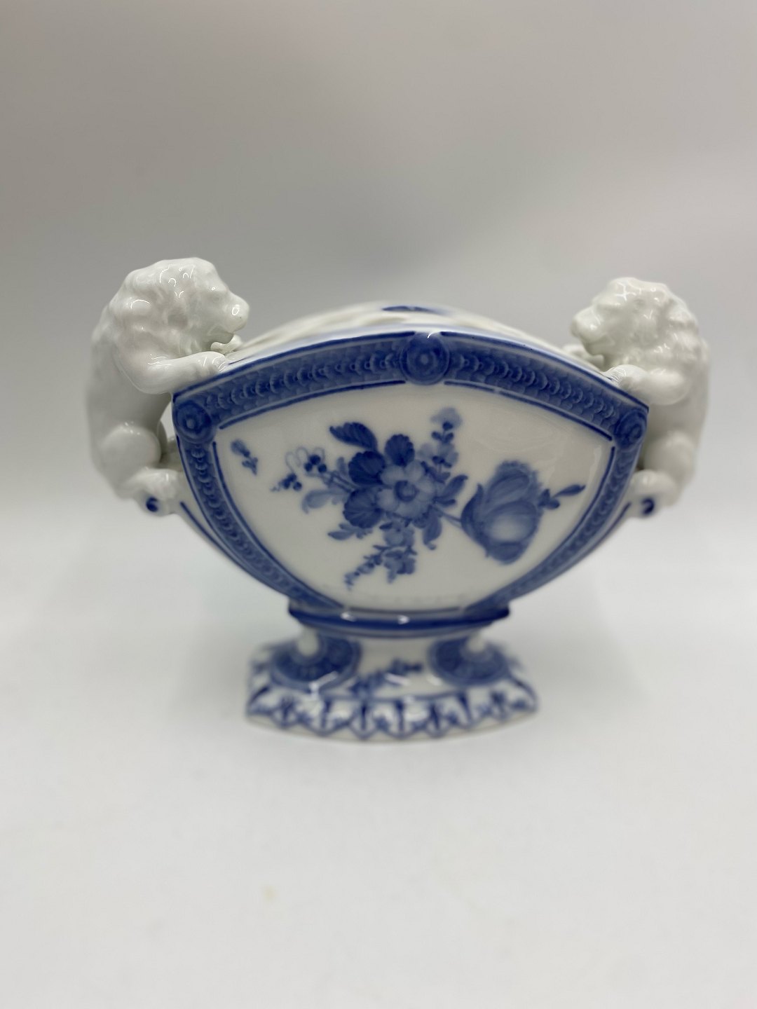 Royal Copenhagen porcelæn, blå blomst buketvase med to løve hanke. Nr. 10/1571-1572. Måler 17,5cm høj, 23cm lang. og 9cm bred. 1. sort. Hel og fin stand. Pris 8400kr.Denne fine vase finder du på vores onlineshop LP-Antik-Design.dk