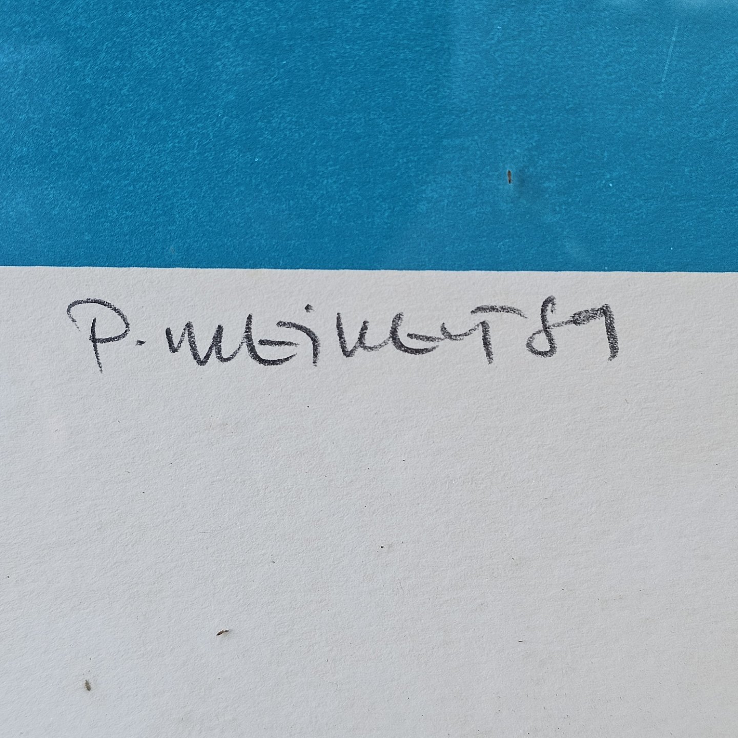 Litografi med abstrakt motiv i blå, turkis og grå monteret i metalramme. Nr. 12/46 og dateret 1989Kunstner Peder Meinert, signeret