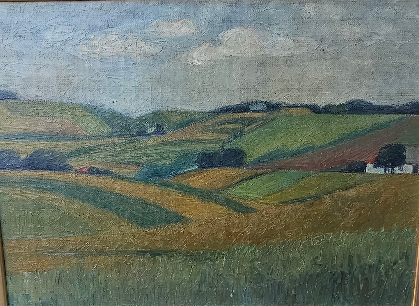 Oliemaleri på lærred med motiv af Mols Bjerge monteret i guldmalet trærammeKunstner Karen Hofman, ikke signeret