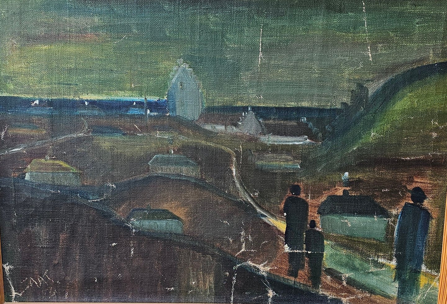 Oliemaleri på lærred med motiv af en kirke i et landsby landskab. Monteret i trærammeKunstner Svend Aage Tauscher (1911-1982), signeret