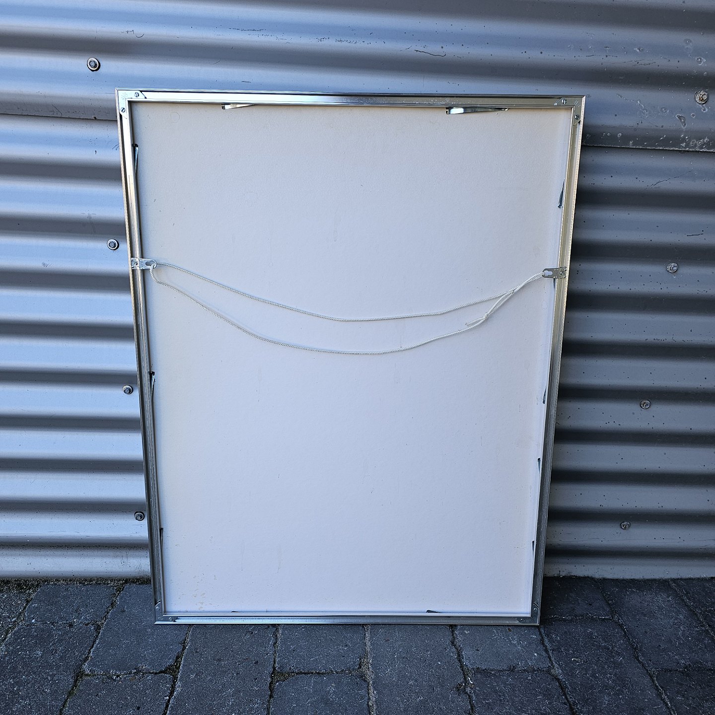 Litografi på papir med abstrakt motiv i sort, gul og rød monteret i sølv rammeVi har to styk