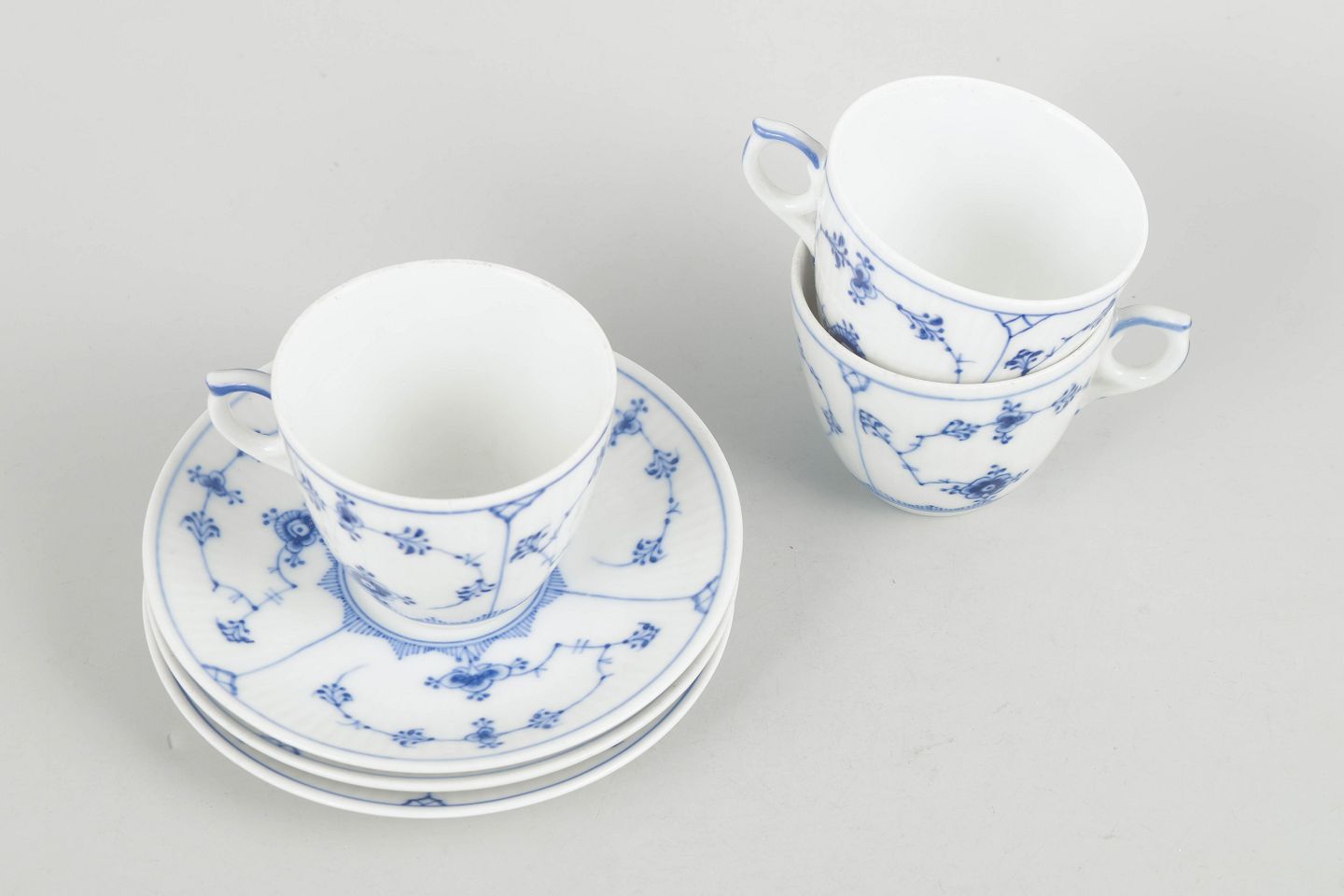 Royal Copenhagen Musselmalet Riflet, sæt af tre kaffekopper med underkopper.Tre kaffekopper med tilhørende underkopper i porcelæn med håndmalet dekoration i underglasurblå i det klassiske Musselmalet Riflet mønster. Model 1/80. Første sortering.