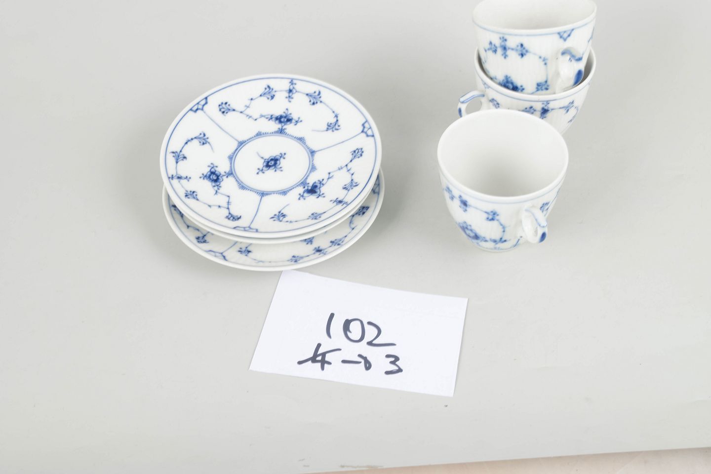 Royal Copenhagen Musselmalet Riflet, sæt af tre kaffekopper med underkopper.Tre kaffekopper med tilhørende underkopper i porcelæn med håndmalet dekoration i underglasurblå i det klassiske Musselmalet Riflet mønster. Model 1/80. Første og anden sortering.