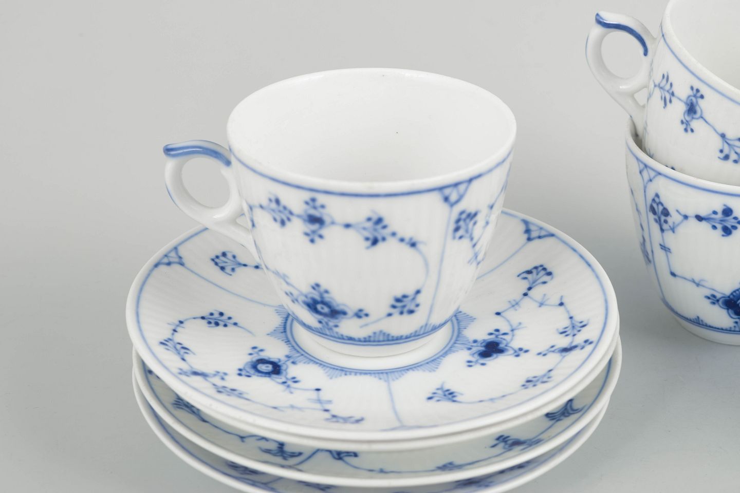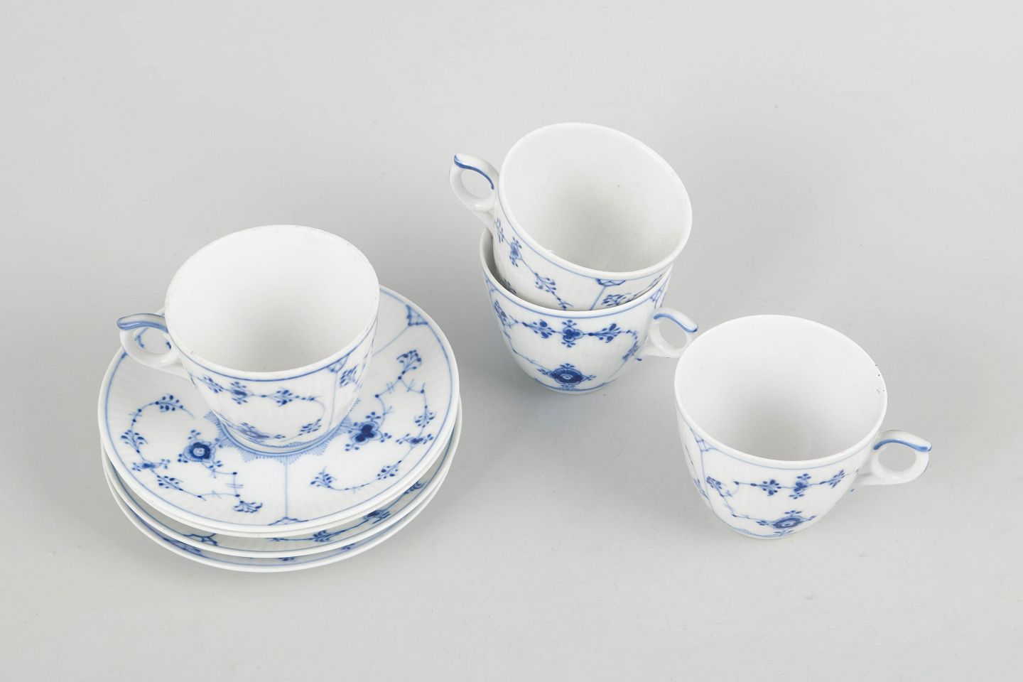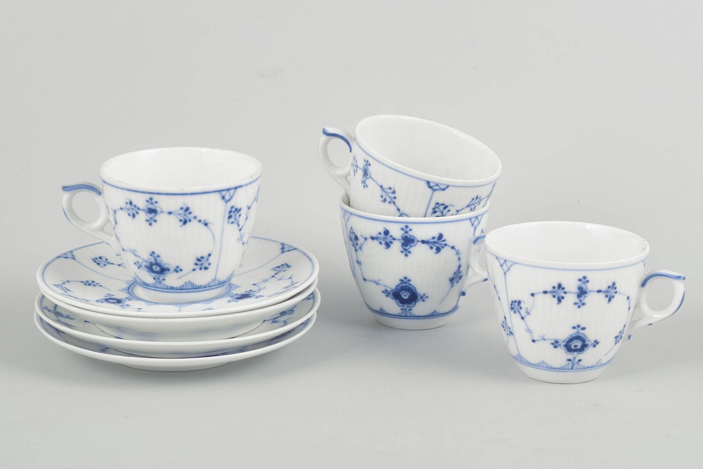 Royal Copenhagen Musselmalet Riflet, sæt af fire kaffekopper med underkopper.Fire kaffekopper med tilhørende underkopper i porcelæn med håndmalet dekoration i underglasurblå i det klassiske Musselmalet Riflet mønster. Model 1/80. Første og anden sortering.