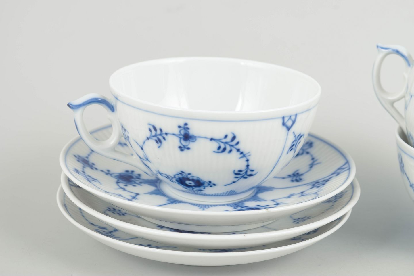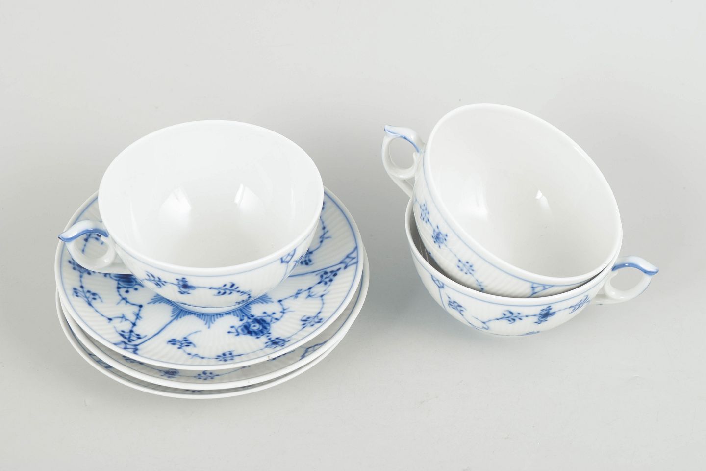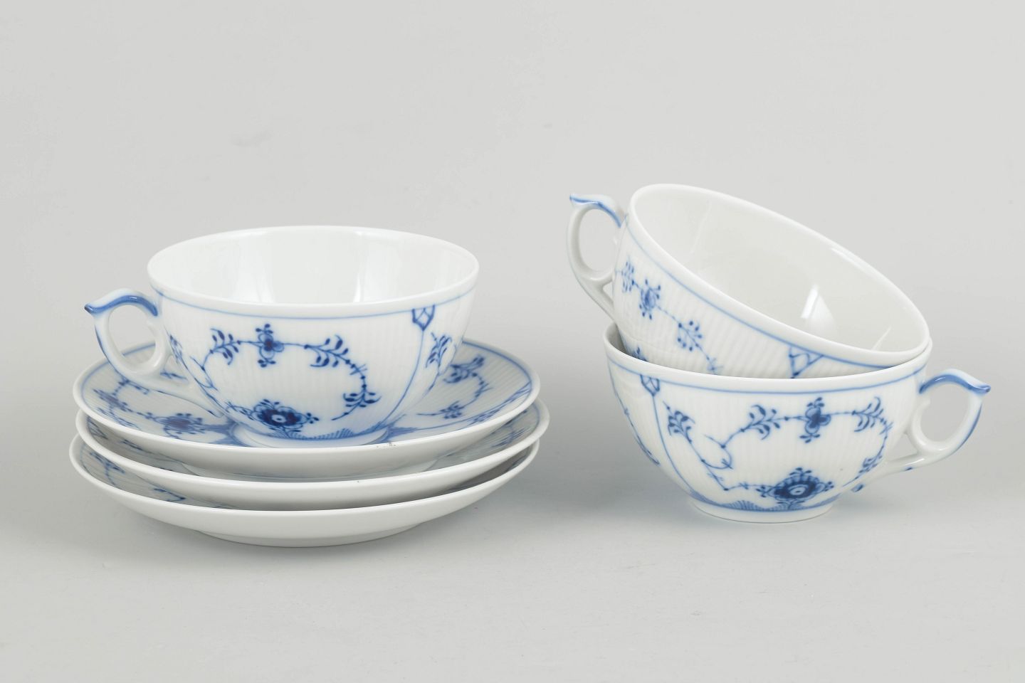 Royal Copenhagen Musselmalet Riflet, sæt af tre tekopper med underkopper.Tre tekopper med tilhørende underkopper i porcelæn med håndmalet dekoration i underglasurblå i det klassiske Musselmalet Riflet mønster. Model 1/315. Første sortering.