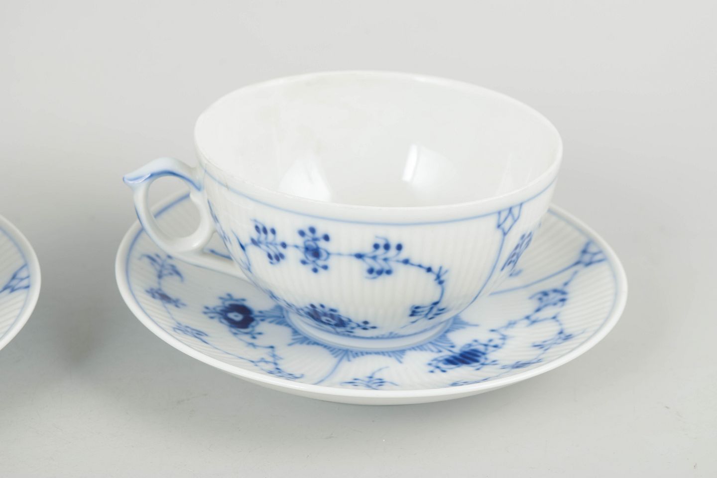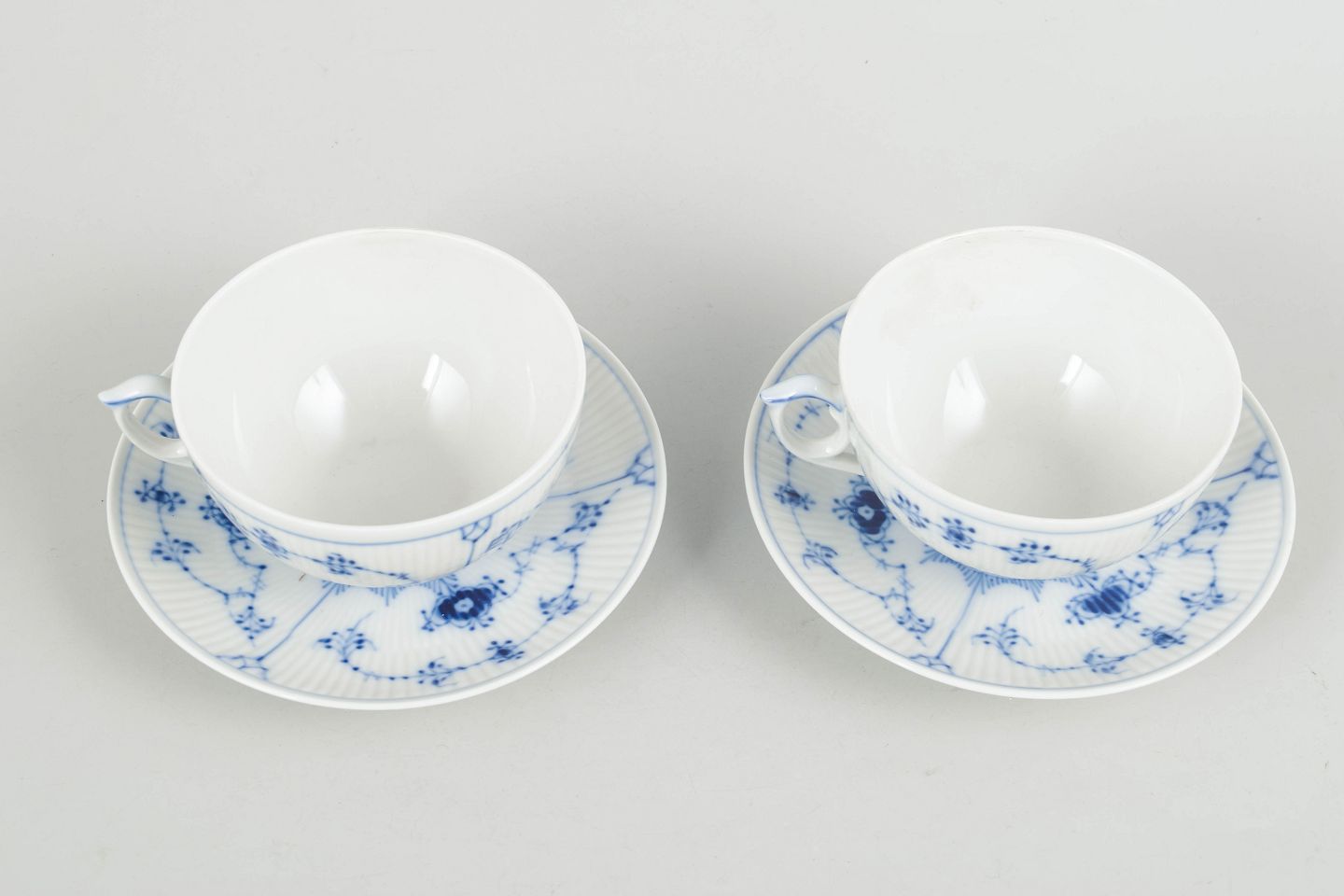 Royal Copenhagen Musselmalet Riflet to tekopper med underkopper.To tekopper med tilhørende underkopper i porcelæn med håndmalet dekoration i underglasurblå i det klassiske Musselmalet Riflet mønster. Model 1/315. Første sortering.