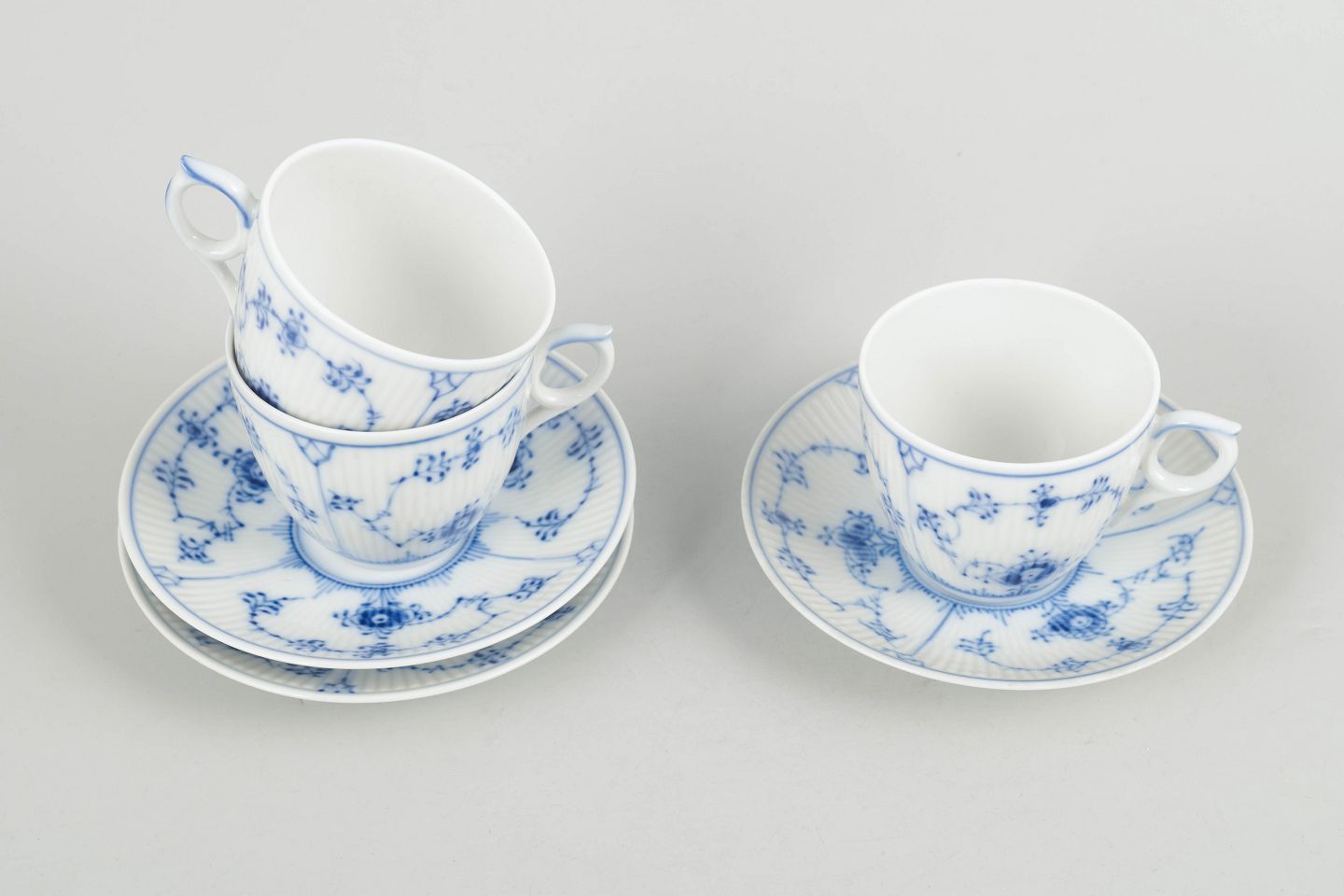 Royal Copenhagen Musselmalet Riflet kaffekopper med underkopper, sæt af tre.Kaffekopper med tilhørende underkopper i porcelæn med håndmalet dekoration i underglasurblå i det klassiske Musselmalet Riflet mønster. Model 1/2162. Første sortering.