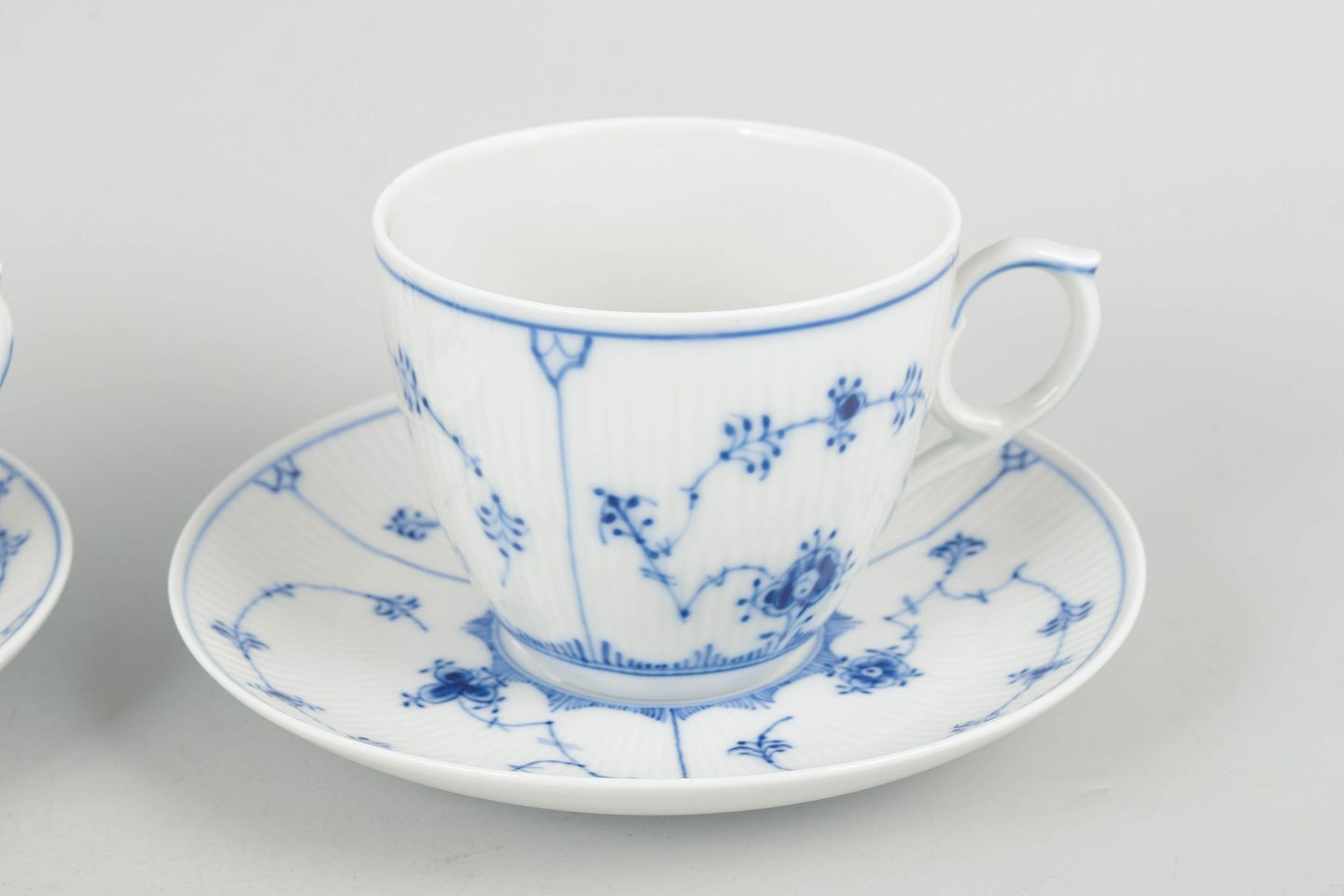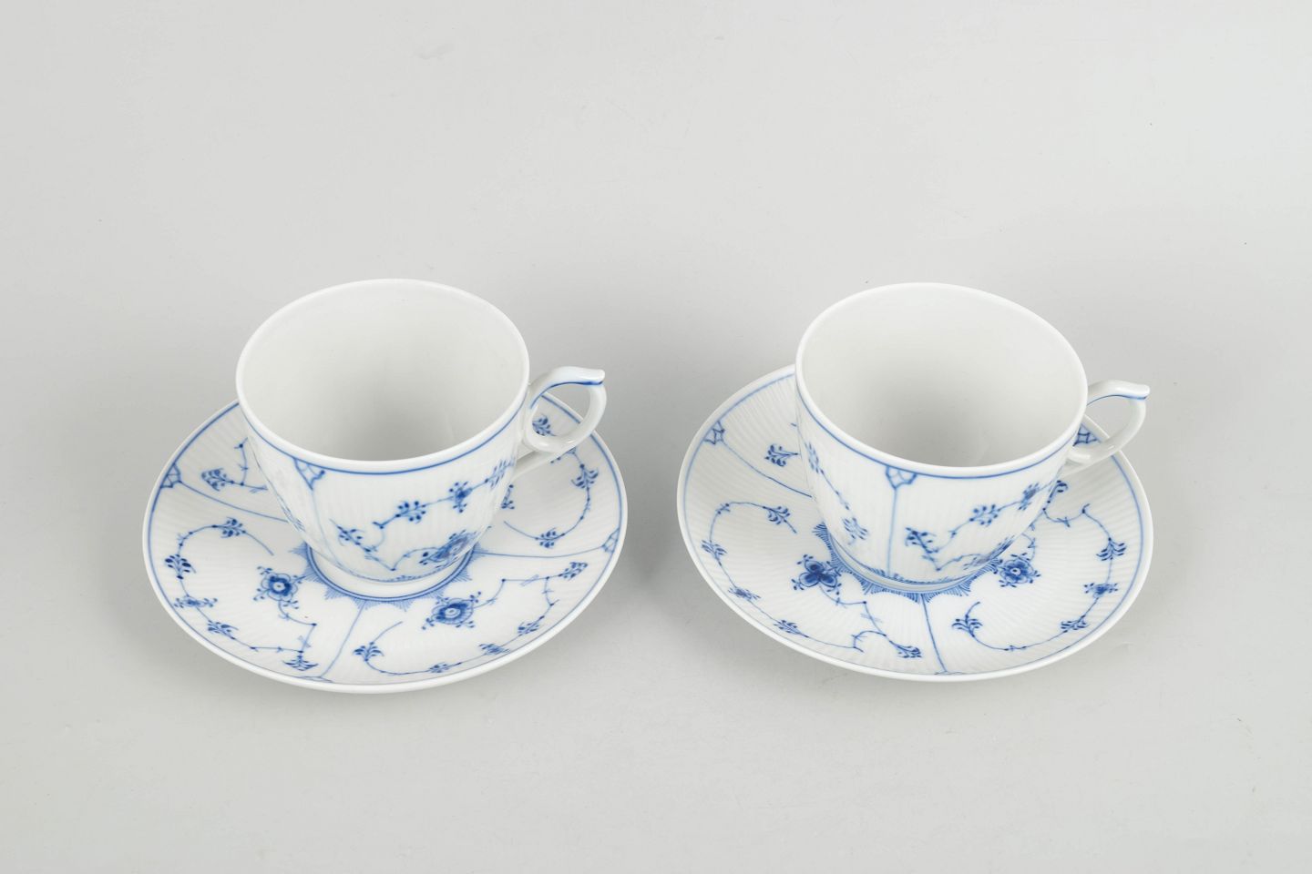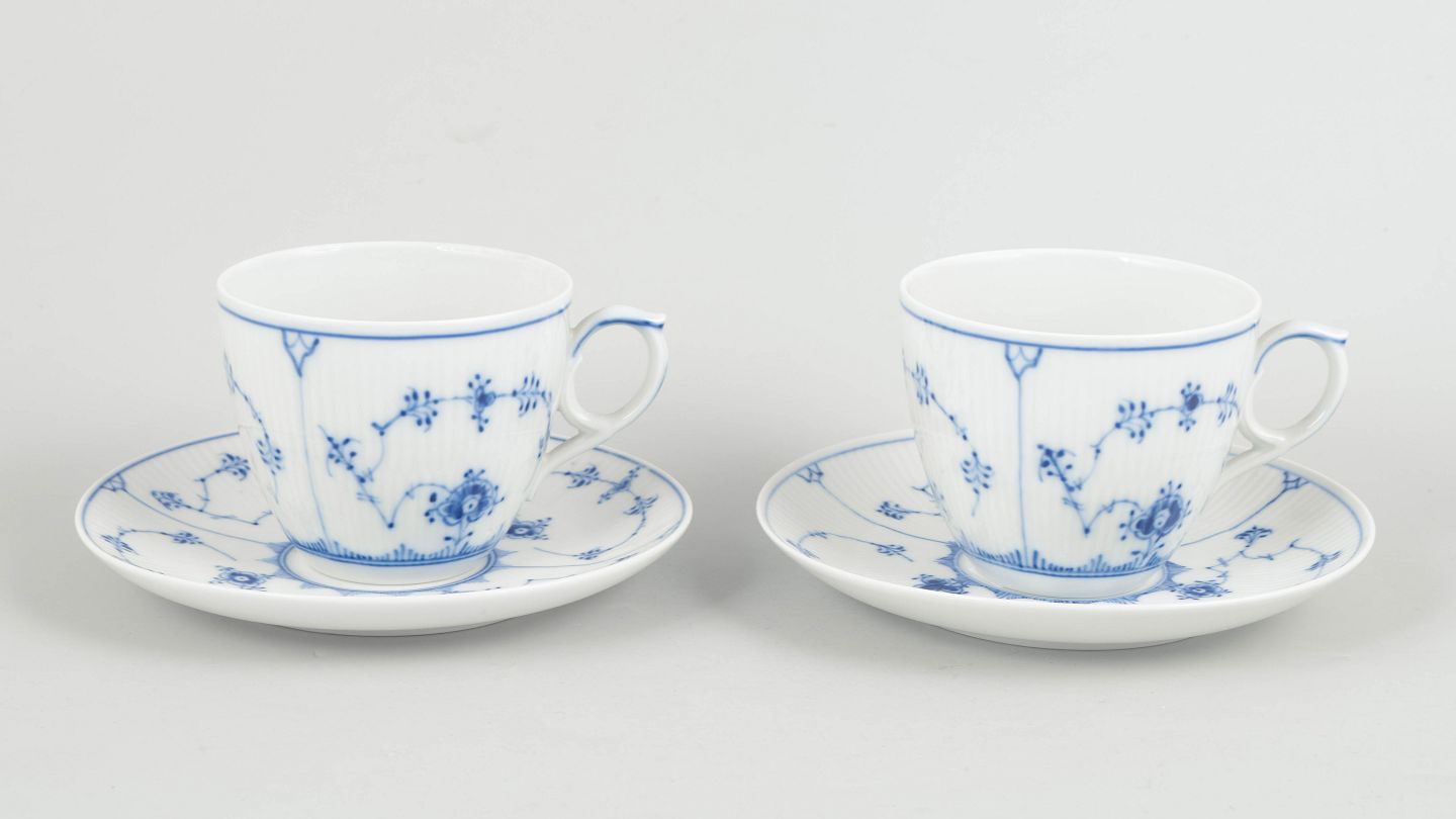 Royal Copenhagen Musselmalet Riflet morgenkopper med underkopper, par. Sjælden.Morgenkopper med tilhørende underkopper i porcelæn med håndmalet dekoration i underglasurblå i det klassiske Musselmalet Riflet mønster. Model 1/78. Første sortering.