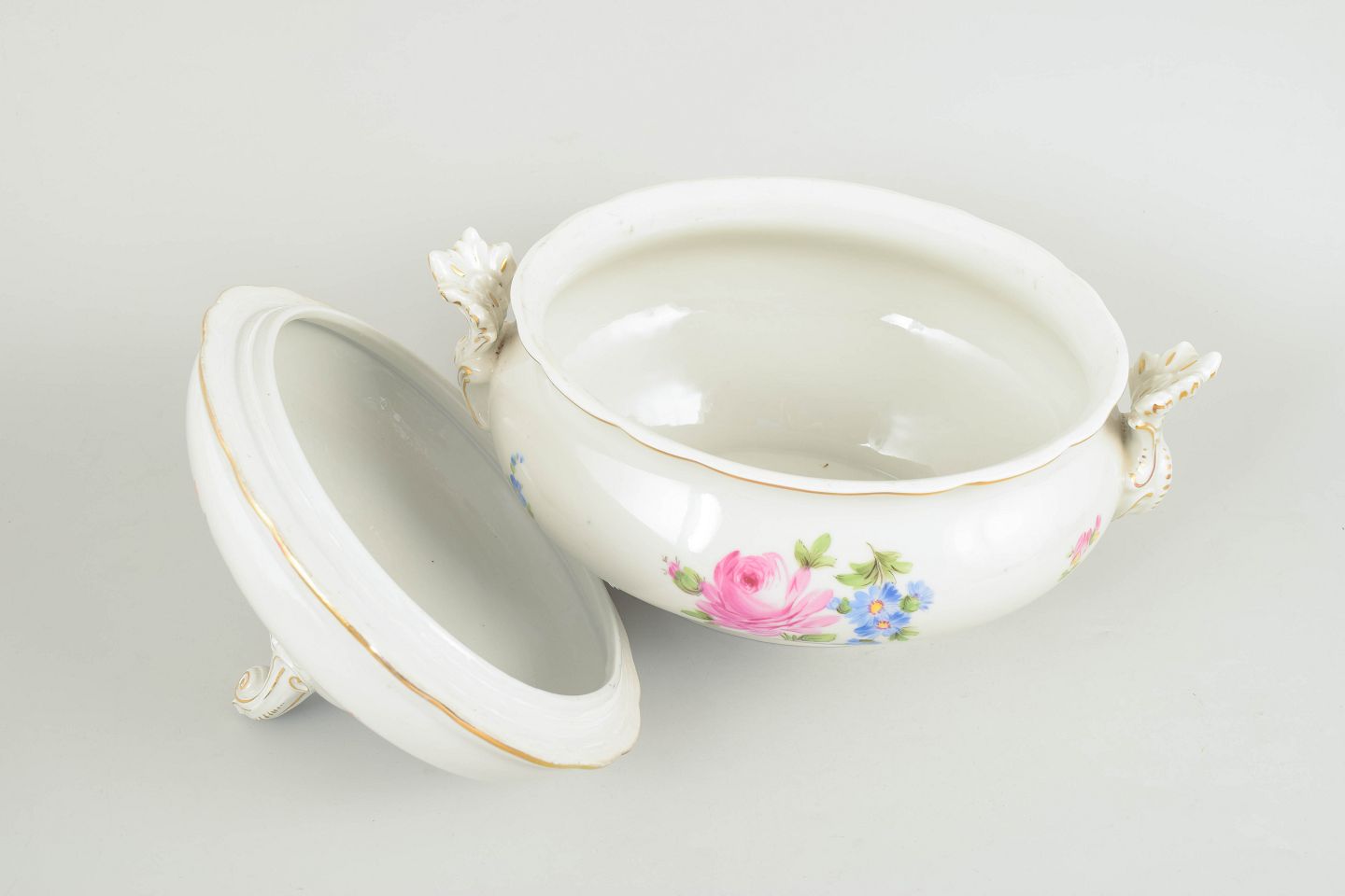 Meissen stor terrin med låg, Saksisk blomst.Stor terrin i håndmalet porcelæn med floral dekoration i polykrome farver og forgyldte detaljer, udført i klassisk Saksisk blomst mønster. Uden synlig fabriksmærkning.