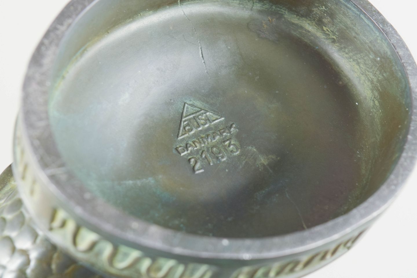 Just Andersen, fiskefigur i diskometal.Skulpturel fiskefigur i diskometal udført i et markant og dekorativt art deco formsprog. Model 2193.