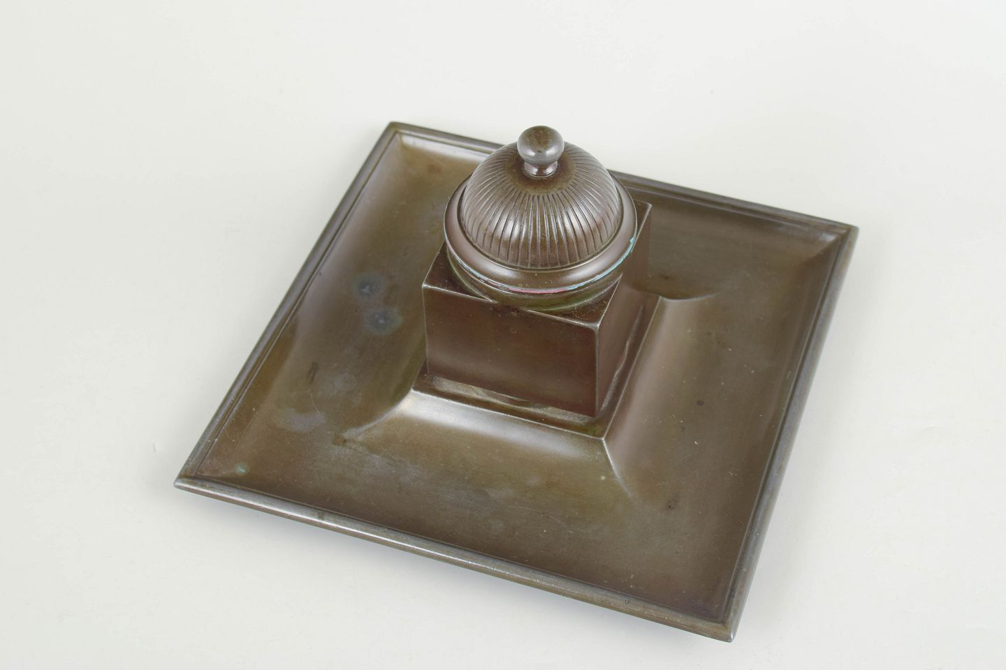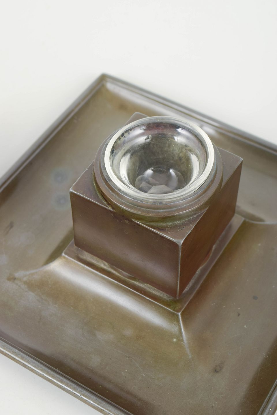 Just Andersen, blækhus i diskometal.Blækhus i diskometal med kvadratisk bakke, firkantet beholder, riflet låg og original glasindsats. Model 162.