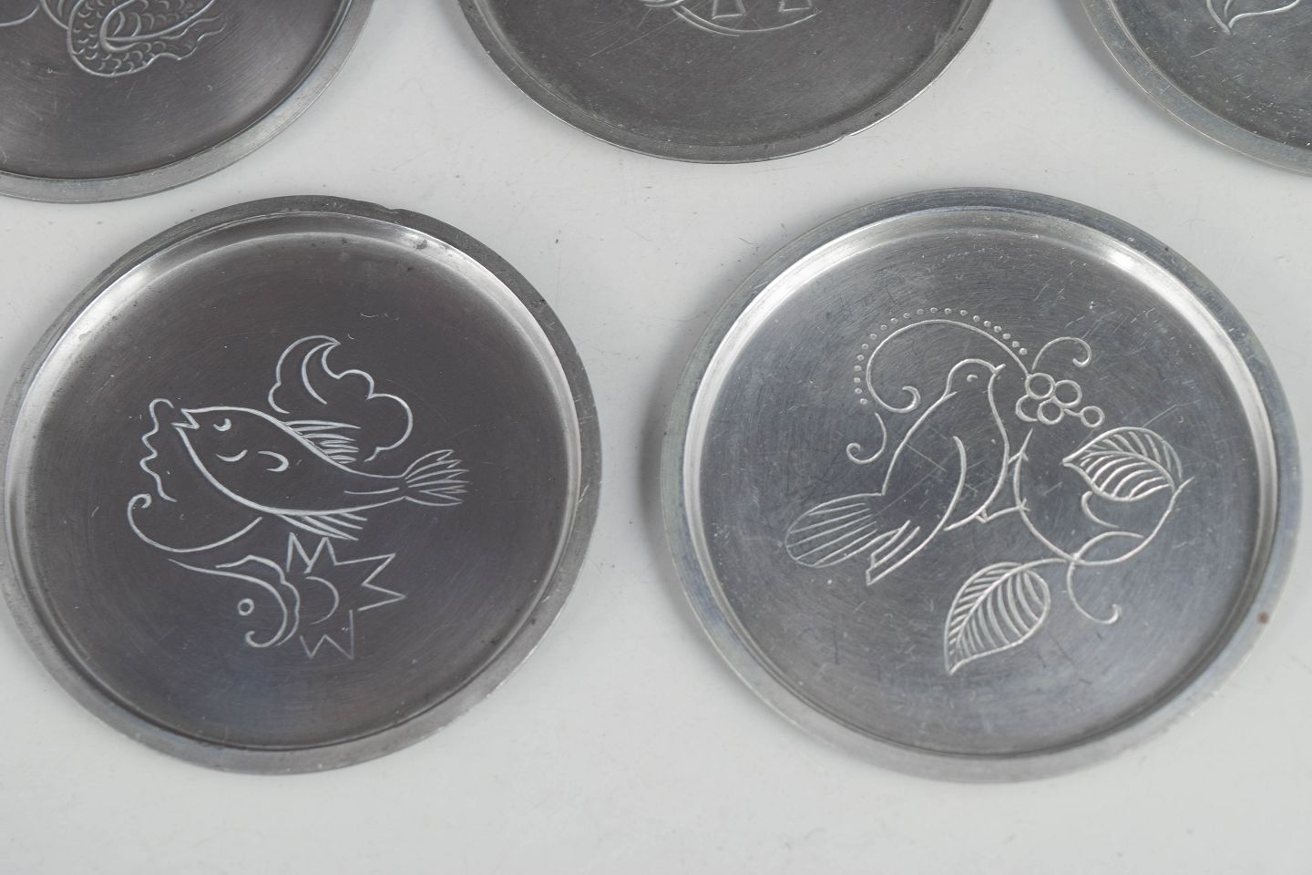 Just Andersen, sæt af otte glasbakker i tin.Sæt af otte flaskeunderlag i tin med indgraverede dyremotiver i et stiliseret art deco formsprog. Model 1166.