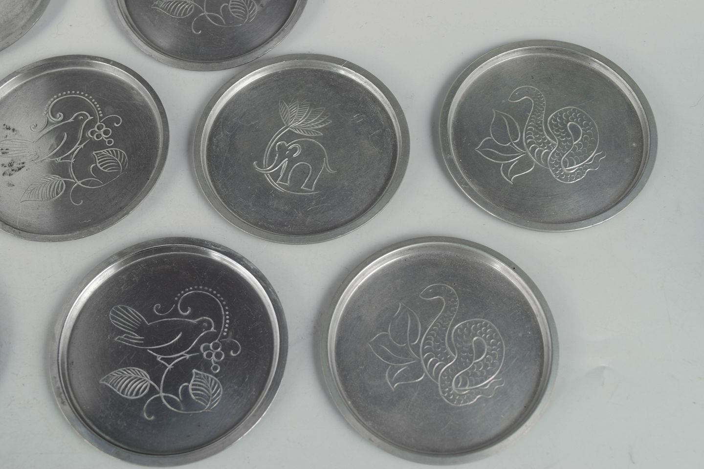 Just Andersen, sæt af ni flaskebakker i tin.Sæt af ni flaskebakker i tin med indgraverede dyremotiver i et stilrent art deco formsprog. Model 1166.