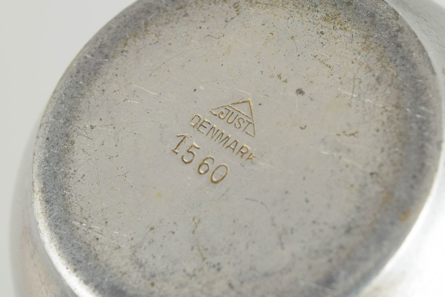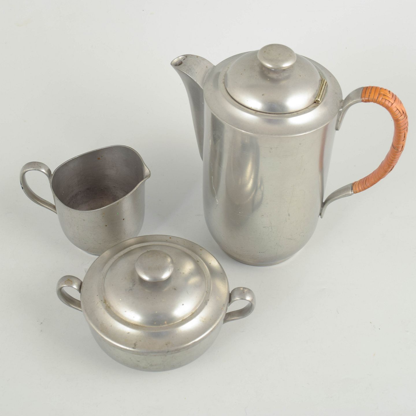 Just Andersen, kaffesæt i tin.Kaffesæt i tin udført i art deco stil, bestående af kaffekande med flettet hank, flødekande og sukkerskål med låg. Kaffekande model 1303. Flødekande model 1560. Sukkerskål model 1560B.