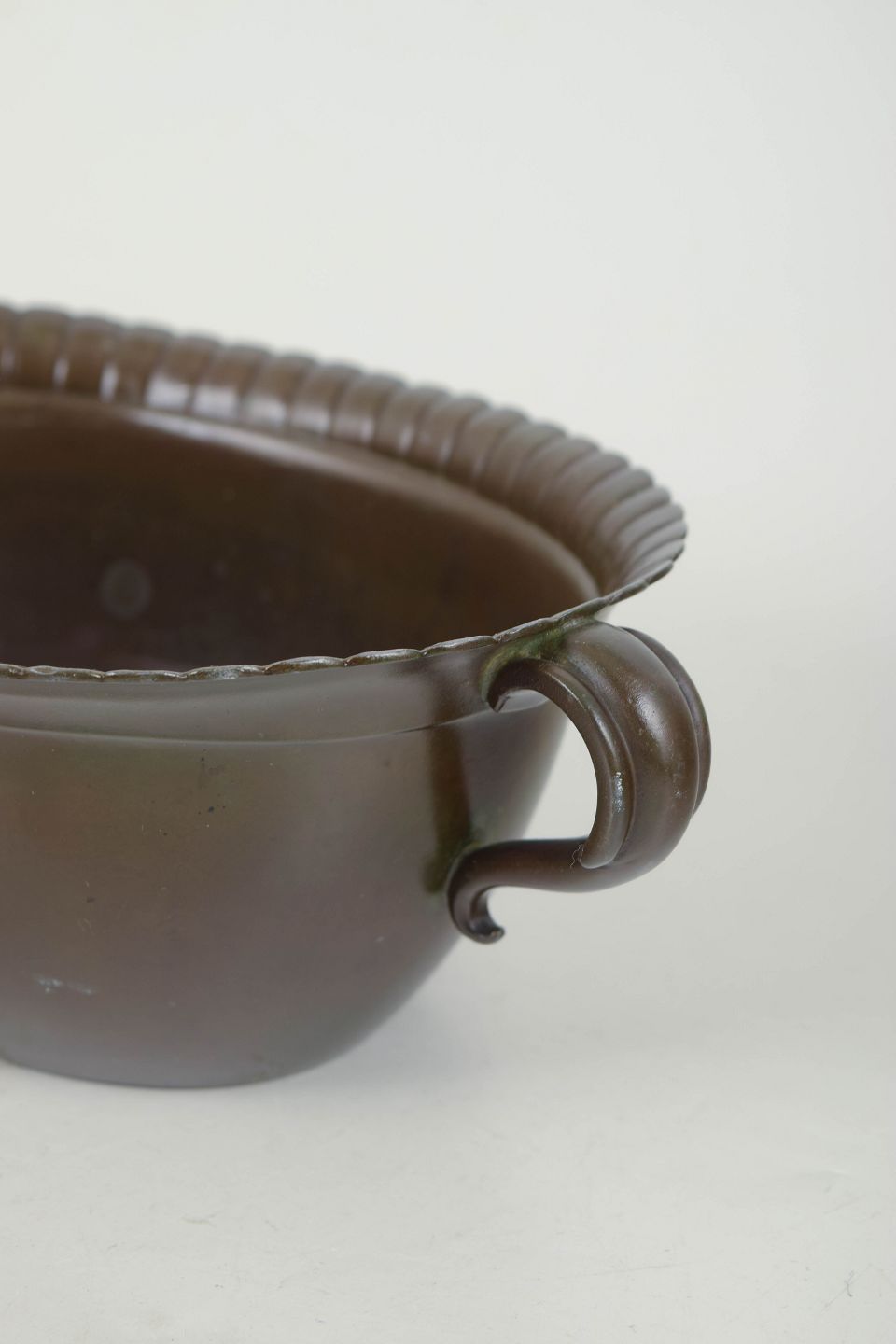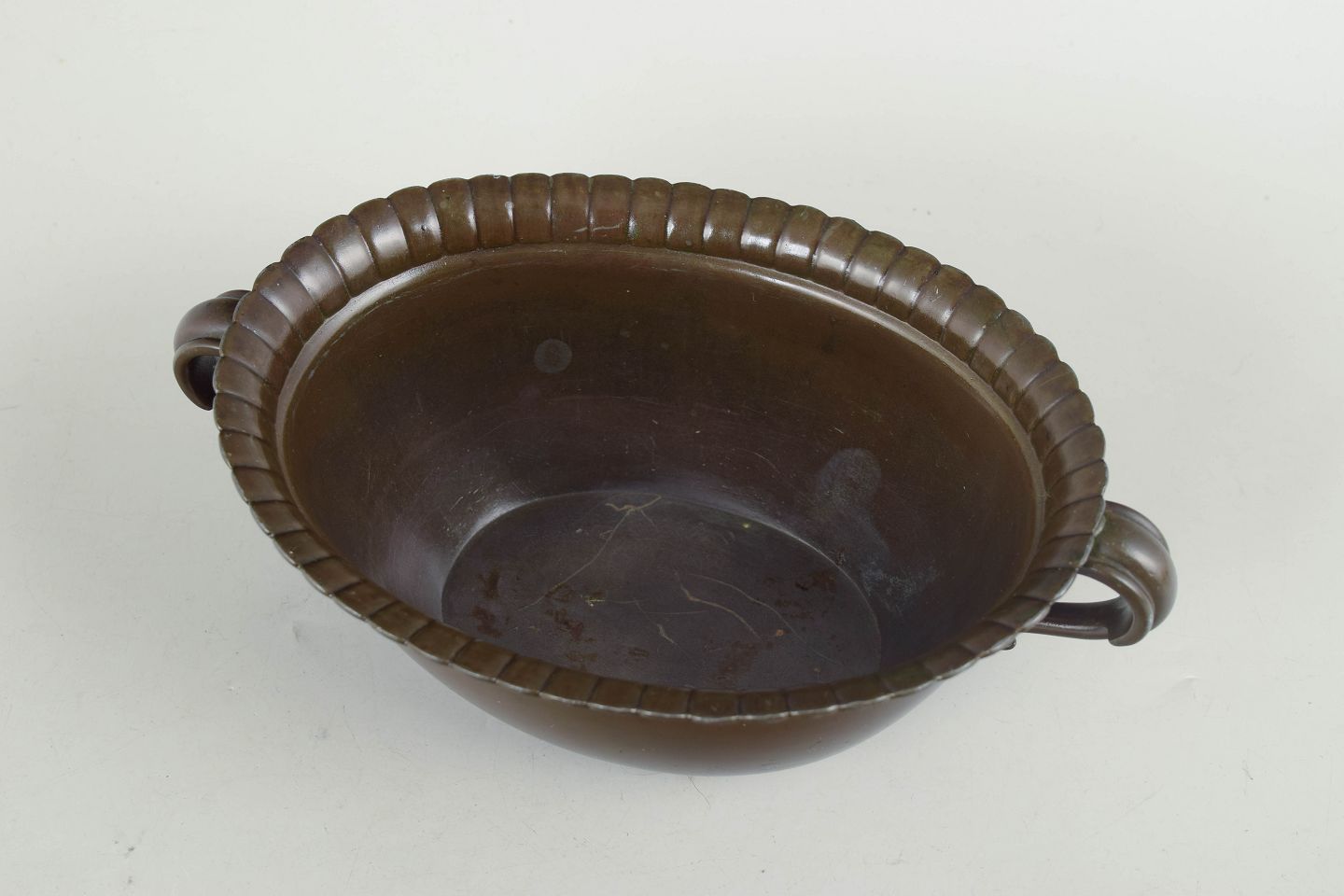 Just Andersen, skål i diskometal.Skål i diskometal med to svungne hanke og riflet kant, udført i et karakteristisk art deco formsprog. Model 1819A.