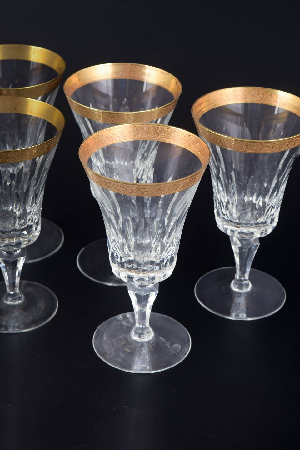 Artemisia, sæt af seks rødvinsglas.Elegante rødvinsglas i facetslebet krystal med dekoration i 24 karat guld langs kanten, udført i klassisk midten af det 20. århundrede stil.