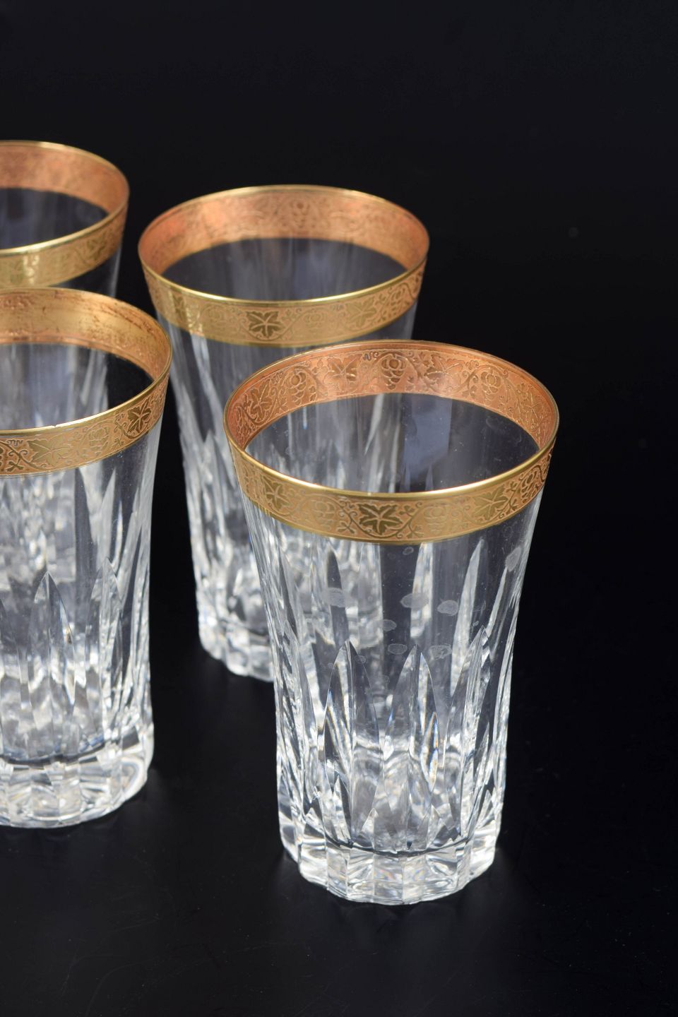 Elegante drikkeglas i facetslebet krystal med dekoration i 24 karat guld langs kanten, udført i klassisk midten af det 20. århundrede stil.