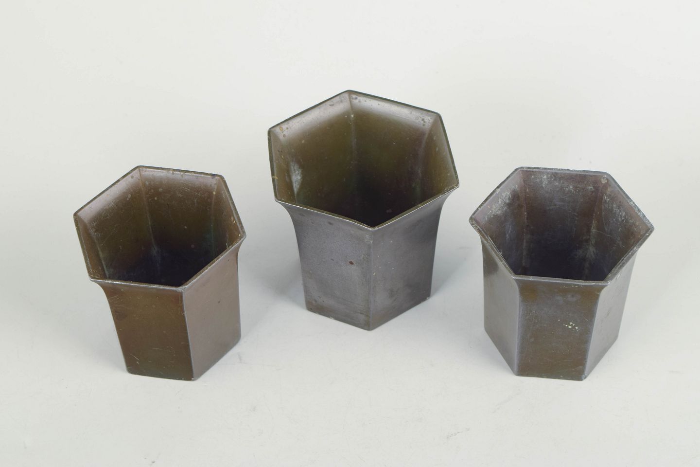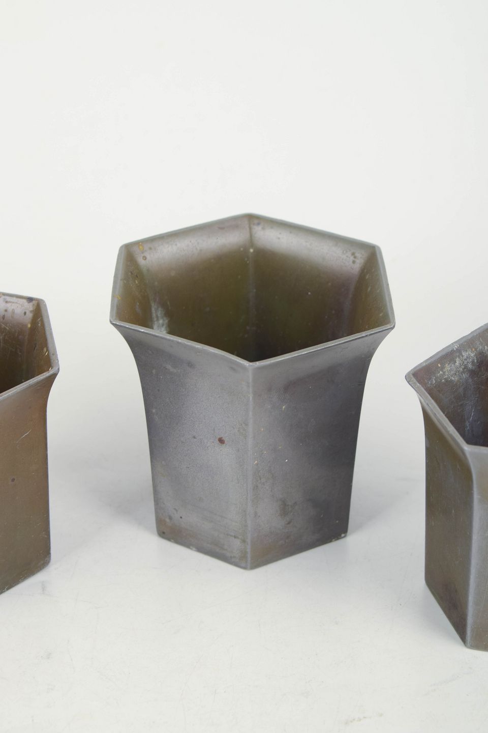 Just Andersen, sæt af tre små vaser i diskometal.Tre små vaser i diskometal med sekskantet korpus og stilrent art deco formsprog. Modeller D22 og D23.