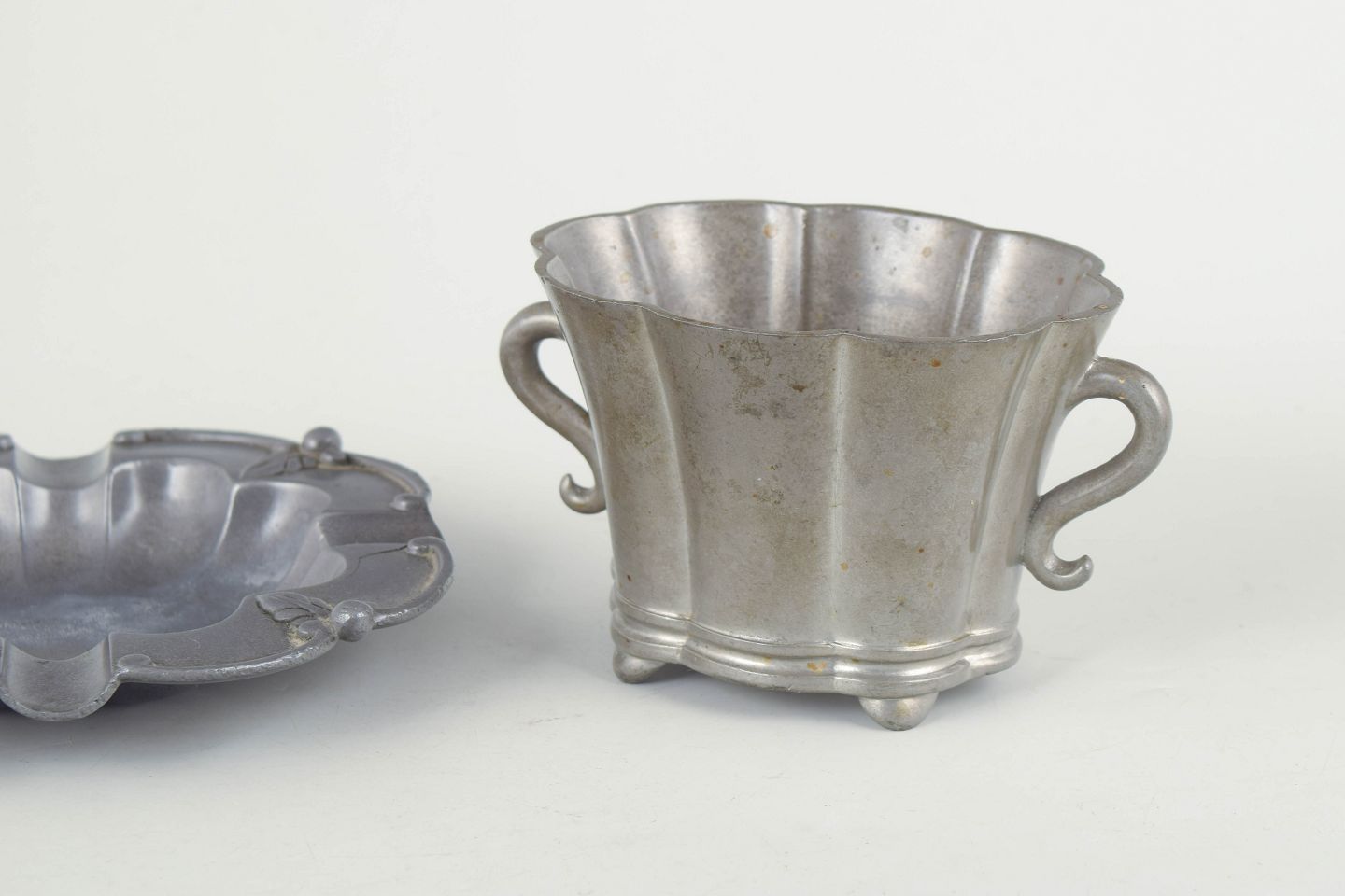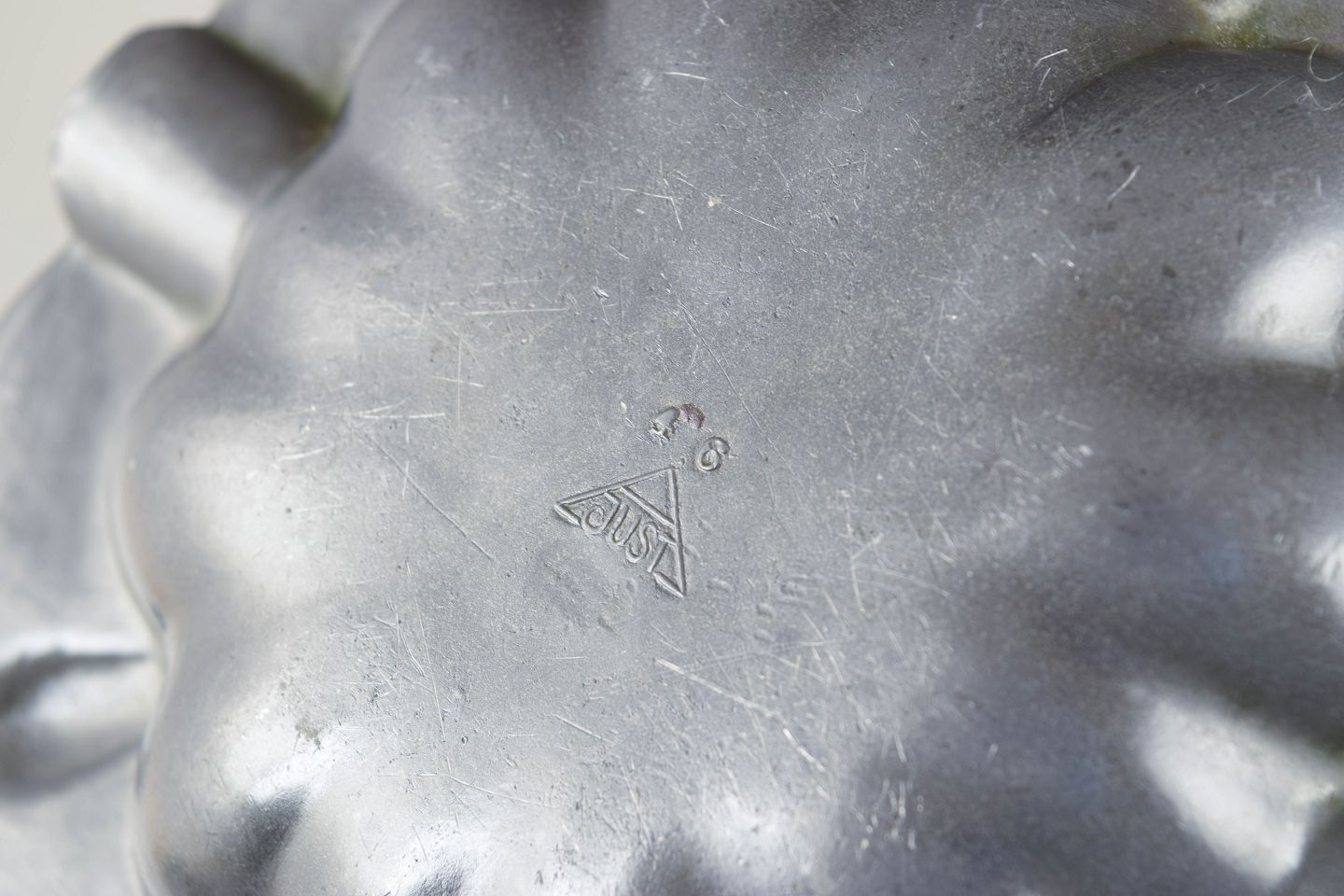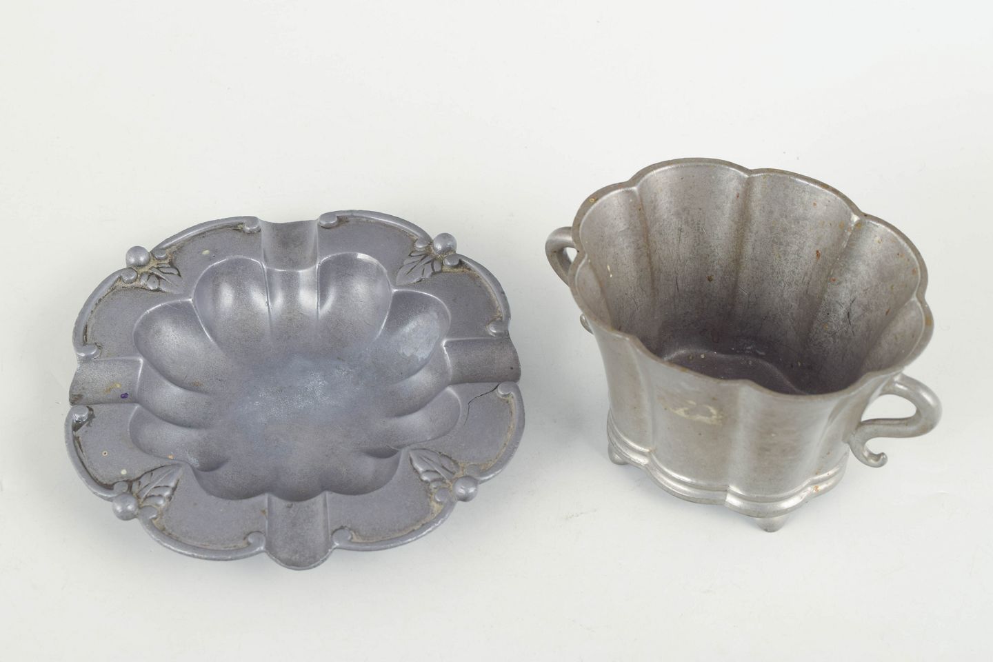 Just Andersen, vase og fad.Vase og fad i tin udført i et elegant art deco formsprog med bløde kurver og stiliserede detaljer. Vase model 46. Fad model 1214.