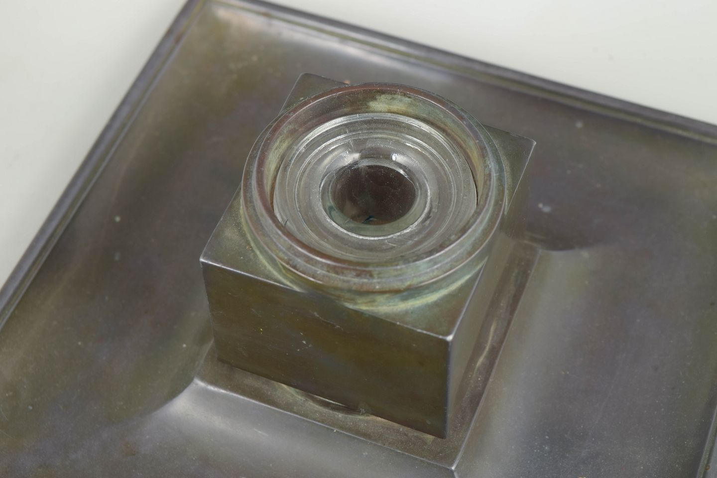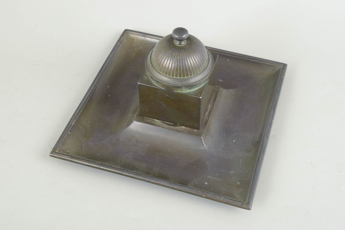 Just Andersen, blækhus model 162 i art deco stil.Blækhus i diskometal med kvadratisk bakke og original glasindsats, toppet med riflet låg i klassisk art deco formsprog.