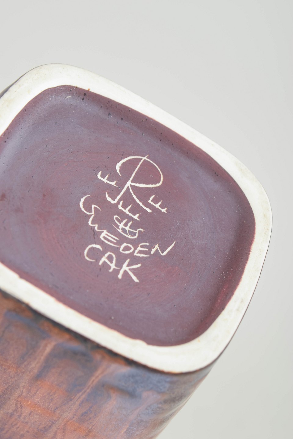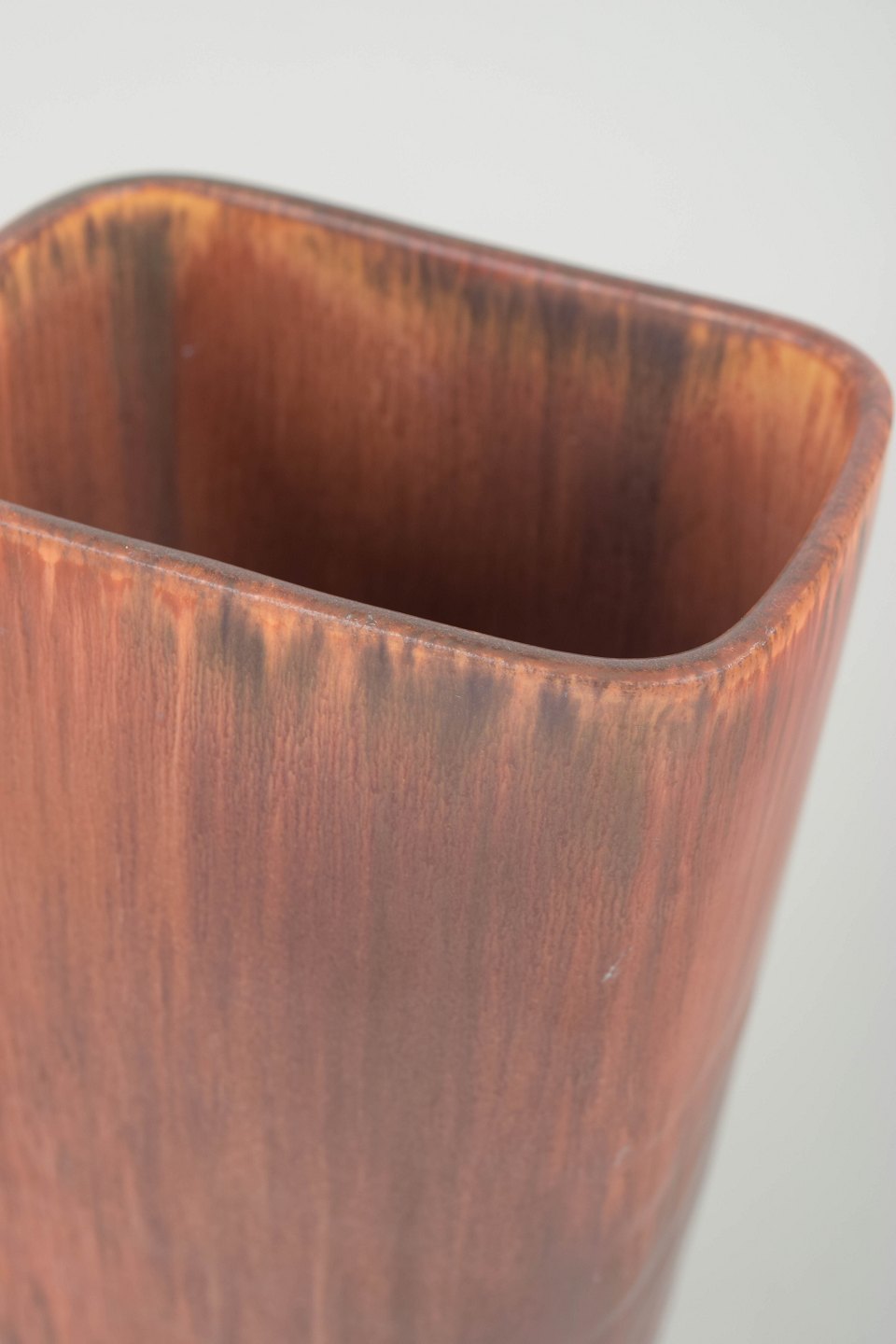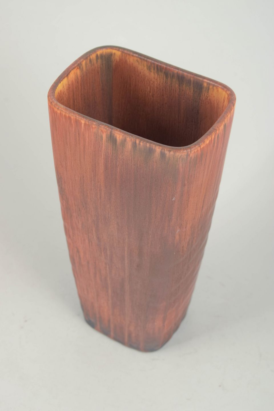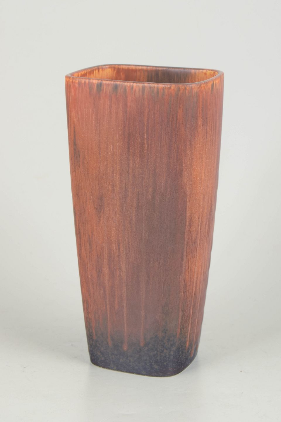Carl-Harry Stålhane for Rörstrand, stor vase.Stor, kantet vase i stentøj med markant rektangulær form og afrundede hjørner. Dekoreret med løbende glasur i varme brunlige og kobbertoner, der samler sig i mørkere nuancer mod bunden. Et kraftfuldt og dekorativt eksempel på Stålhane’s arbejde i større formater.