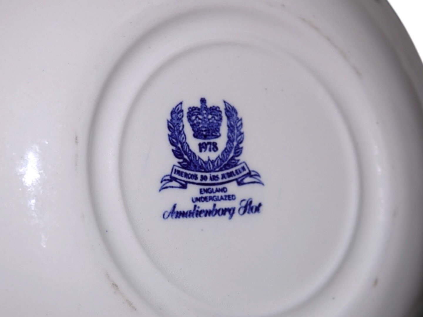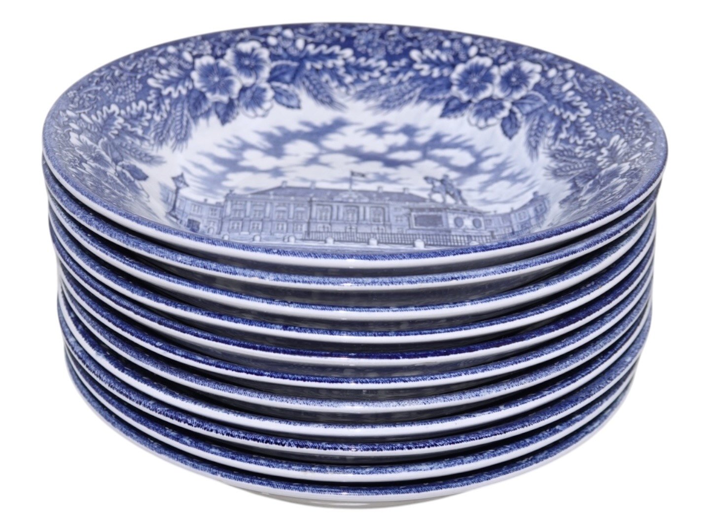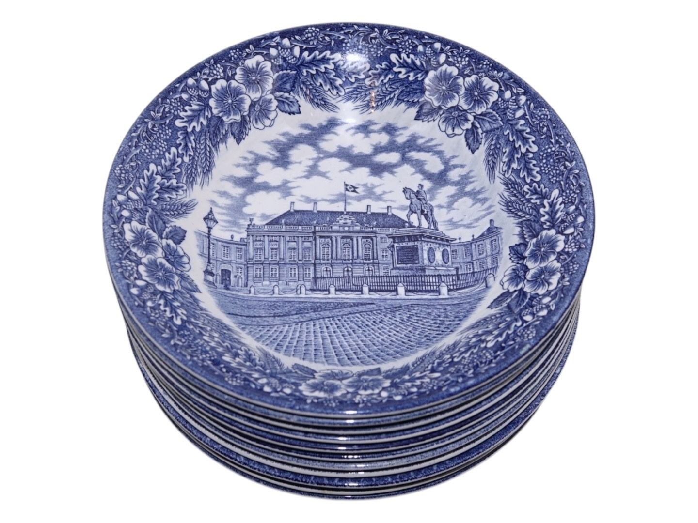 Engelsk fajance, lille dyb tallerken med Amalienborg Slot. Tyk kvalitet som hotelporcelæn / jernporcelæn.Lavet for Imerco i 1978.