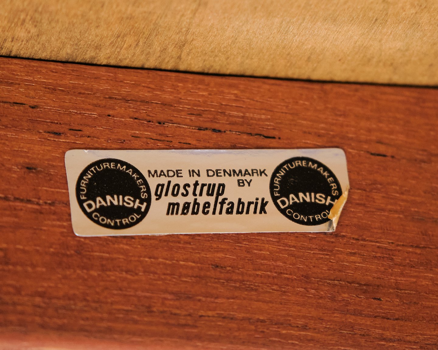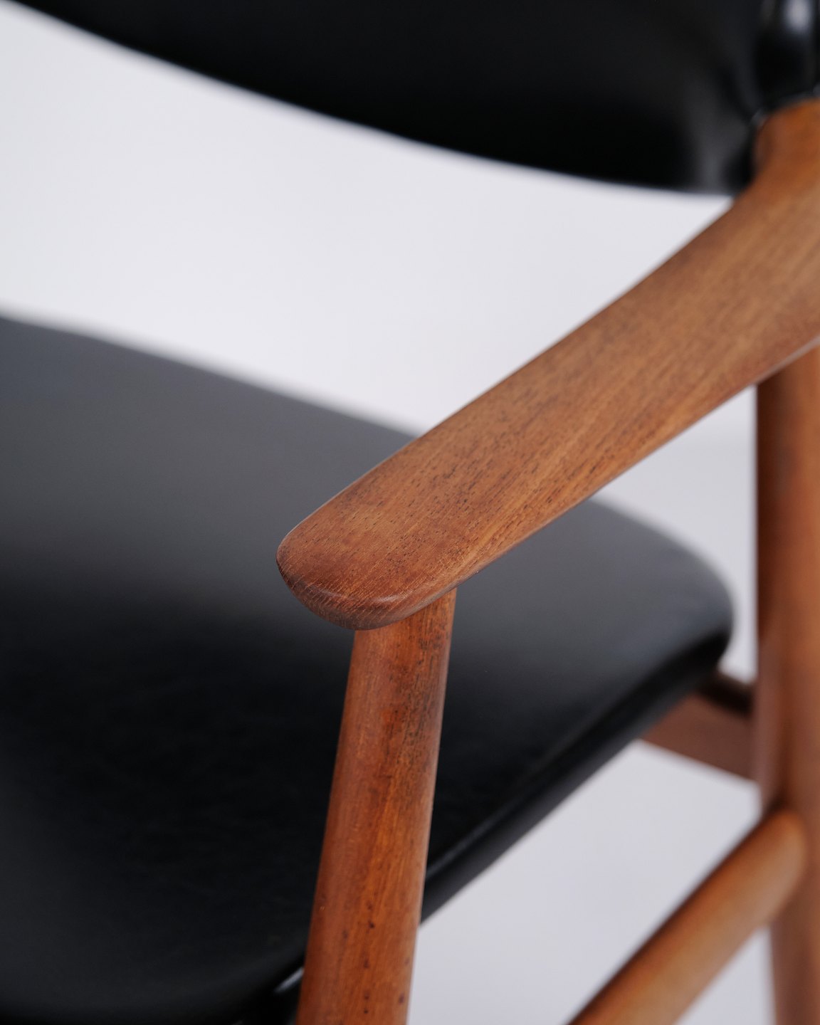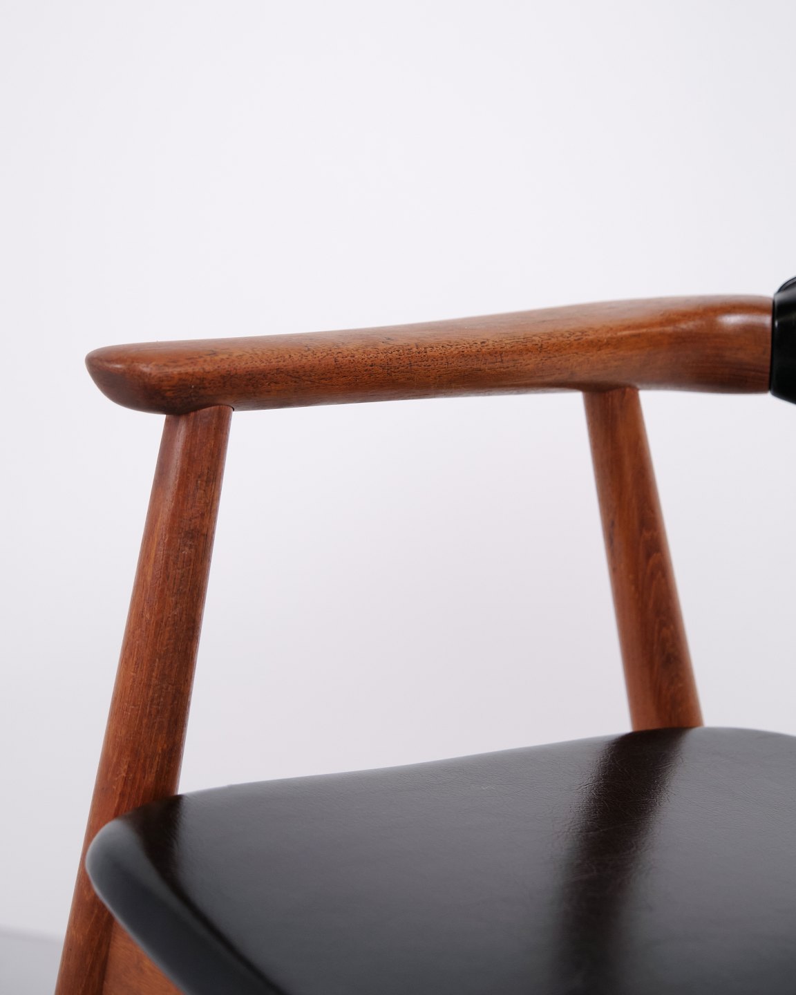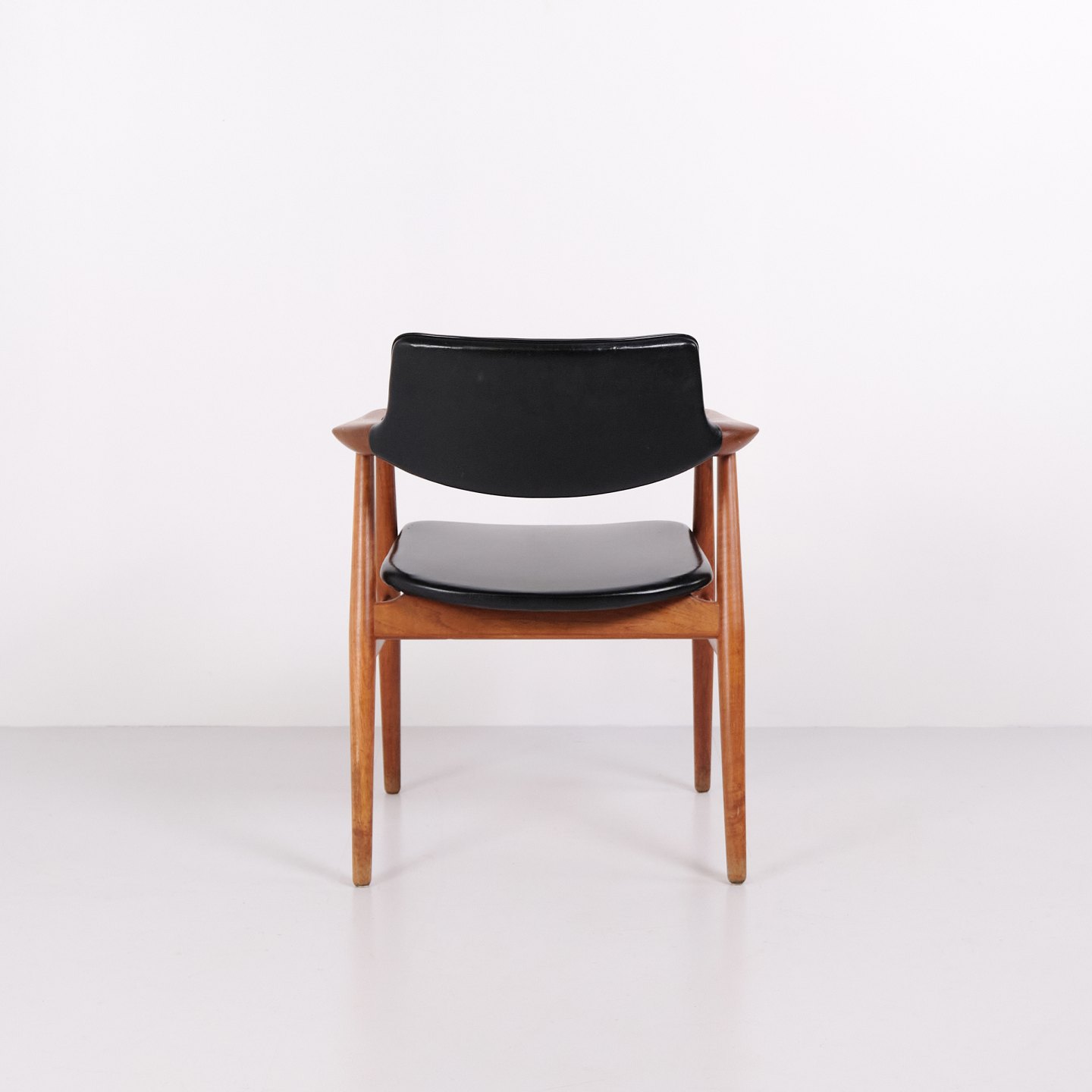 Sæt af 6 GM11 spisestuestole designet af Svend Aage Eriksen for Glostrup Møbelfabrik i 1960’erne. Stolene er udført i massiv teak med sort læder på sæde og ryg. Model GM11 er kendt for de organiske linjer, let svungne armlæn og høj siddekomfort. Et klassisk dansk design med elegant snedkerarbejde og flotte proportioner, velegnet til både spisebord og mødelokale. Sættet sælges kun samlet.— Oprindelse: Danmark