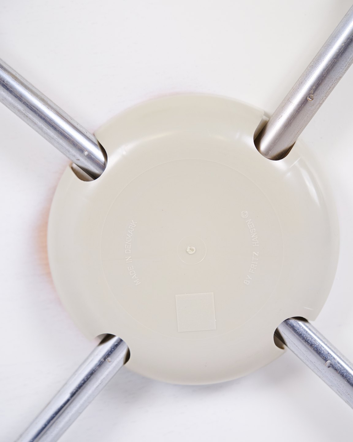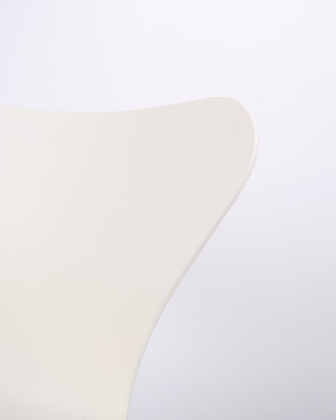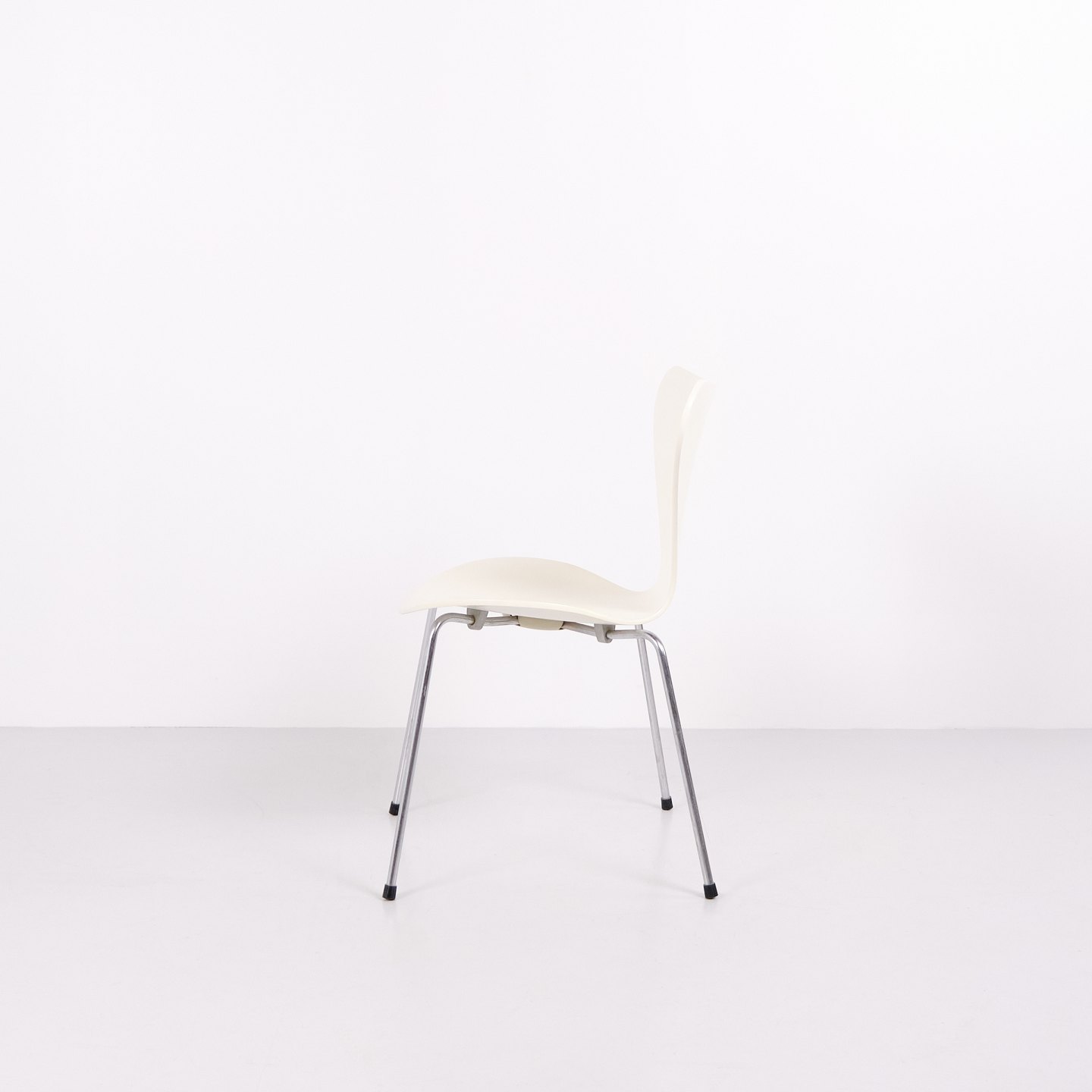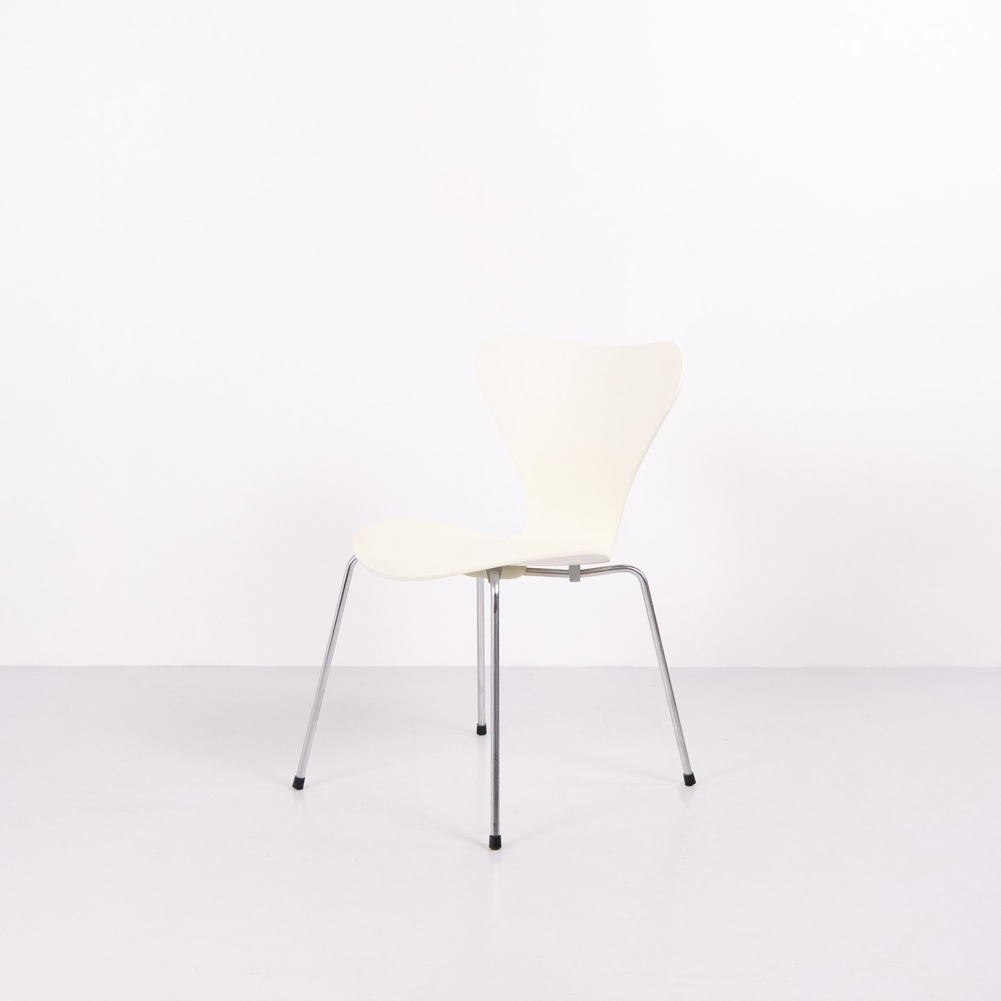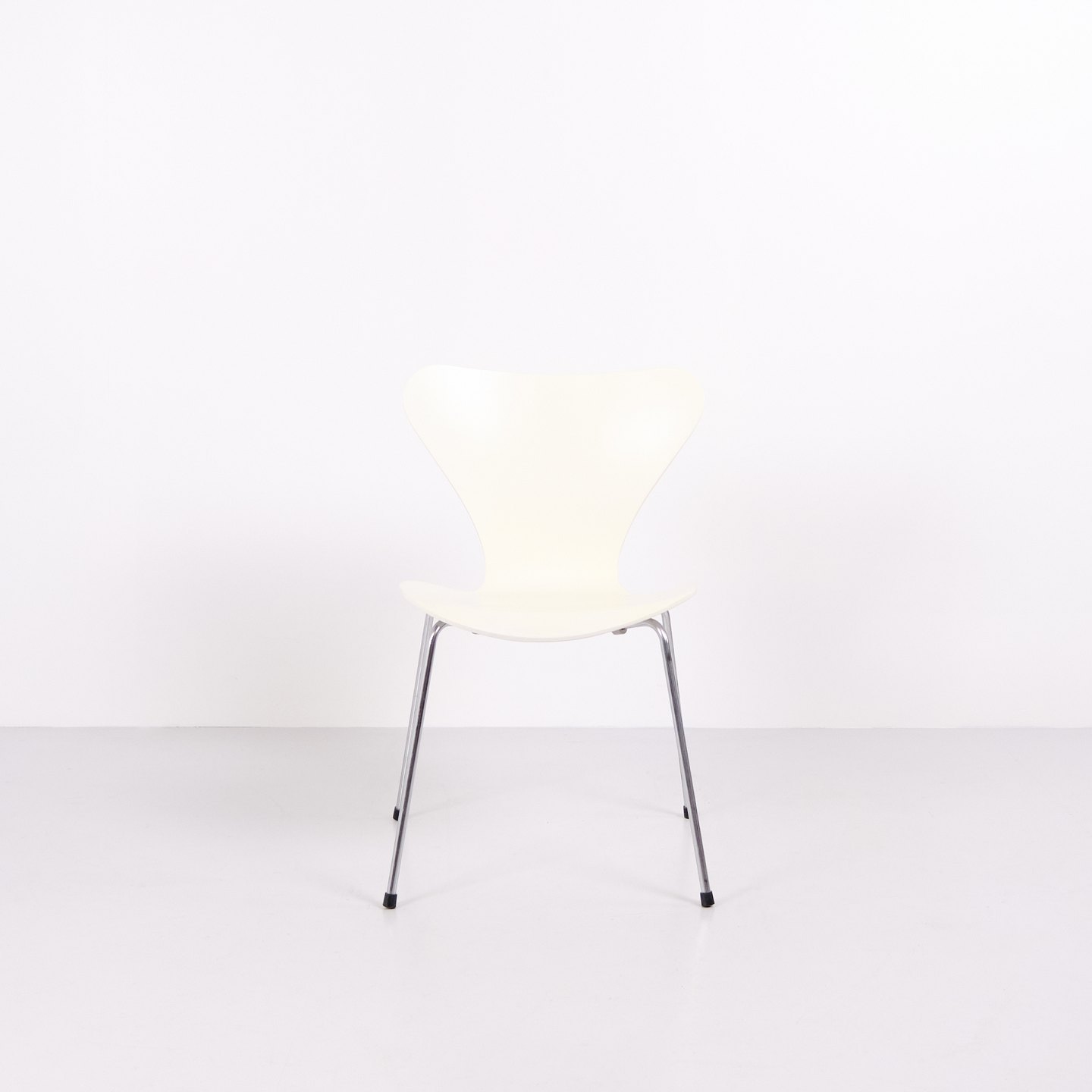Sæt af 6 Syverstole model 3107 designet af Arne Jacobsen for Fritz Hansen. Modellen blev introduceret i 1955 og er en videreudvikling af Myren fra 1952. Stolen er udført i formspændt finér med hvidlakeret overflade og forkromet stålrørsstel. Den karakteristiske syvtalsform gjorde modellen til en af de mest producerede stole i dansk designhistorie. 3107 har været anvendt i private hjem, restauranter, kontorer og offentlige interiører verden over og produceres fortsat af Fritz Hansen. Sælges kun samlet.— Oprindelse: Danmark