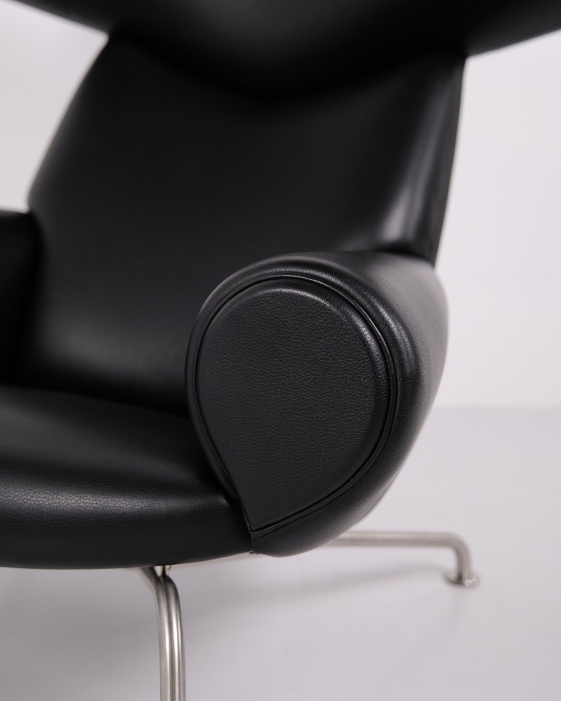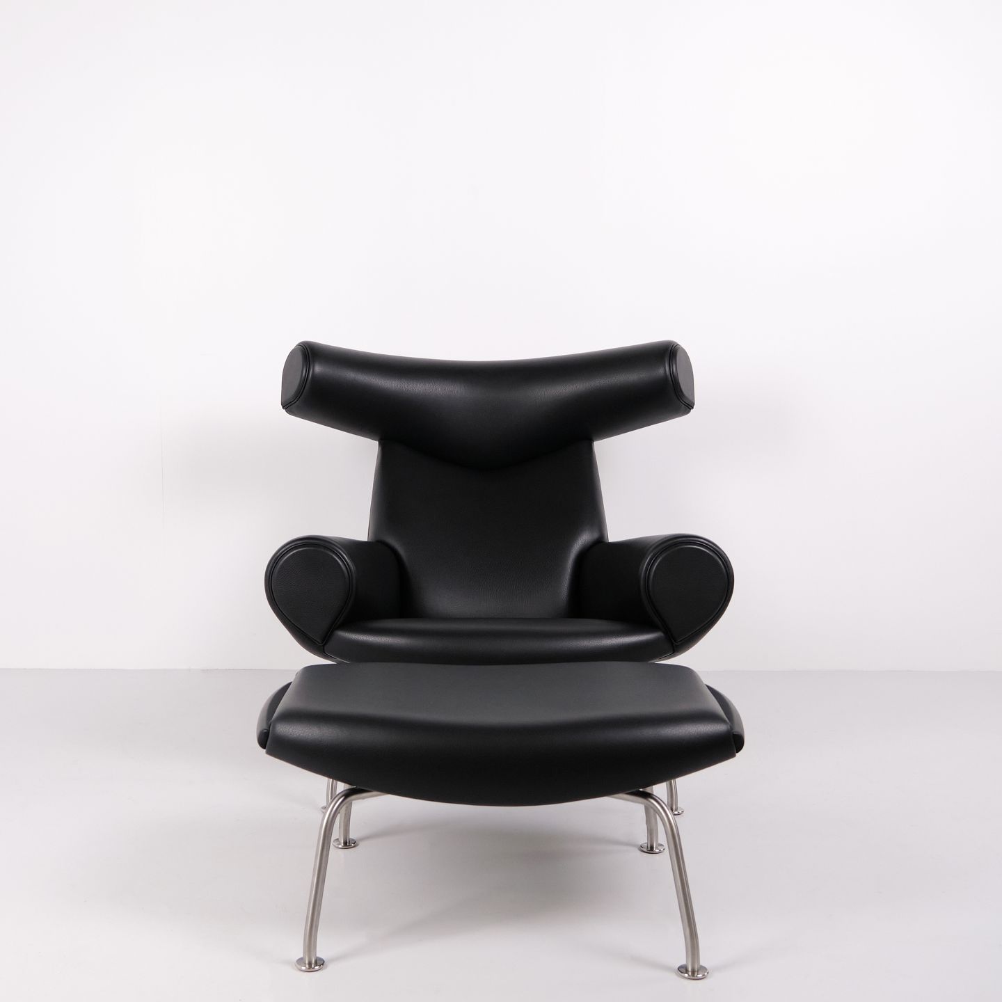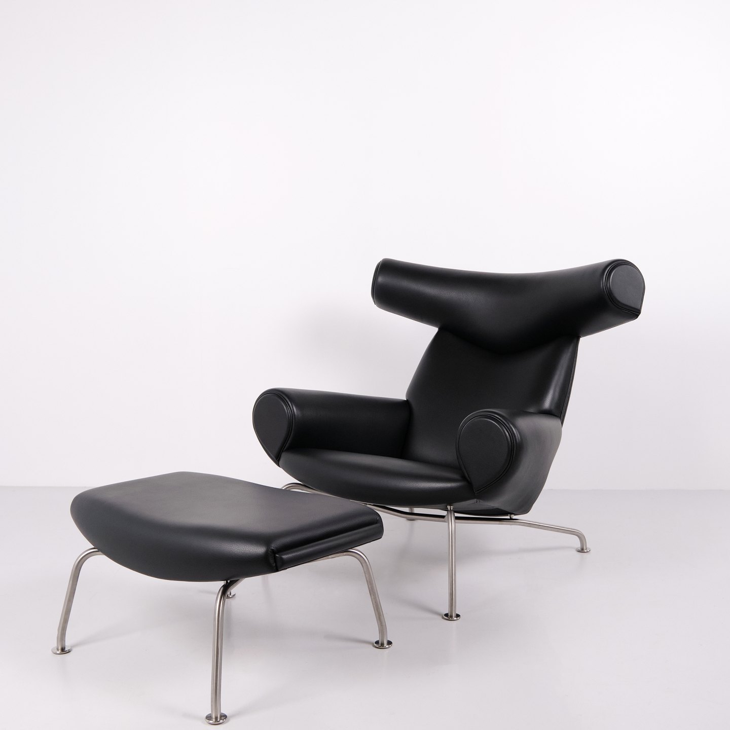 Ox Chair model EJ100 med tilhørende skammel designet af Hans J. Wegner. Modellen blev tegnet i 1960 og produceres i dag af Fredericia Furniture efter overtagelsen af Erik Jørgensen. Stolen er udført i sort læder med stel i stål. Det markante ryglæn med “horn” gav modellen navnet Ox Chair. ´— Oprindelse: Danmark