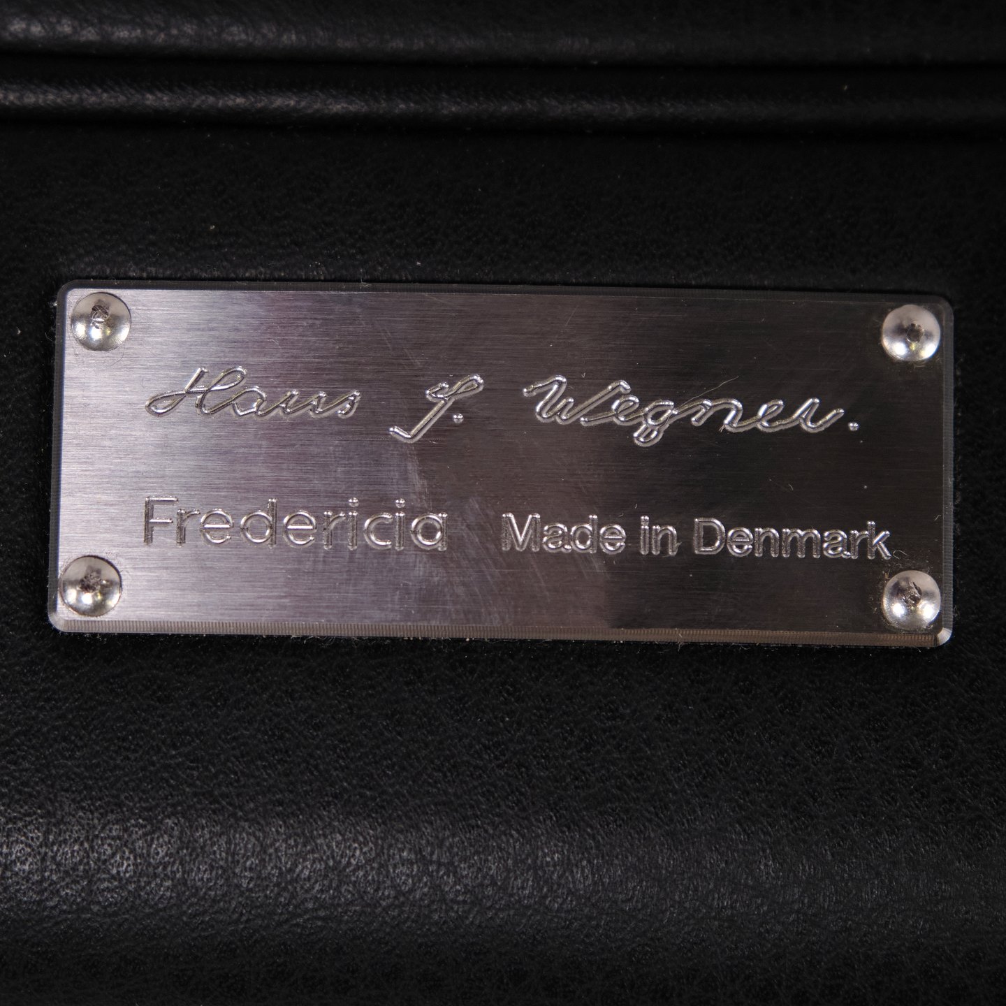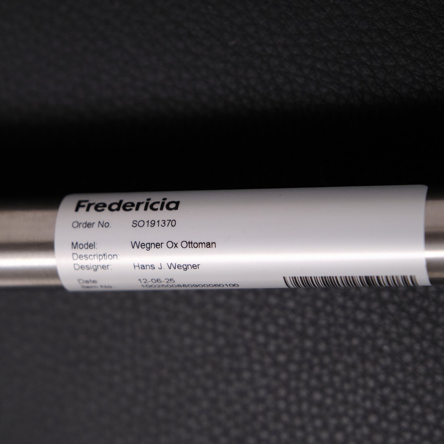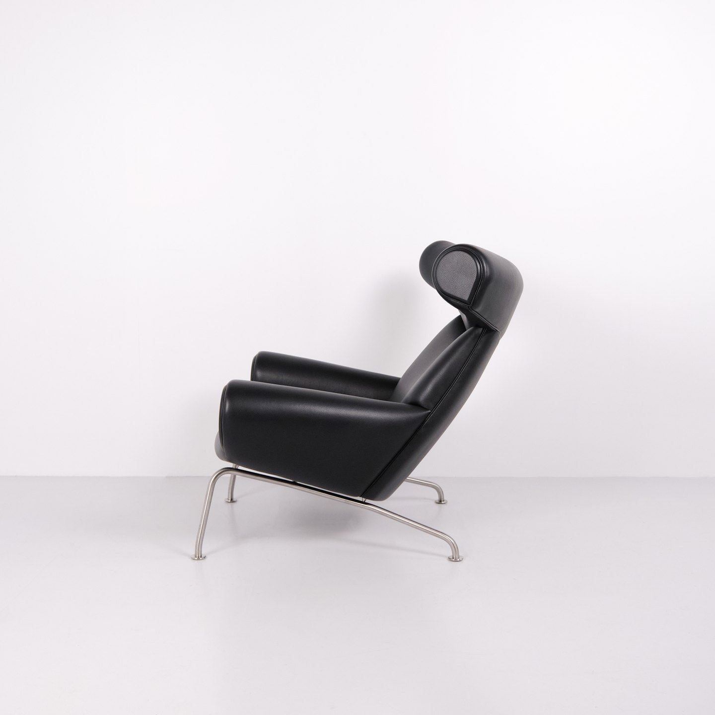 Ox Chair model EJ100 med tilhørende skammel designet af Hans J. Wegner. Modellen blev tegnet i 1960 og produceres i dag af Fredericia Furniture efter overtagelsen af Erik Jørgensen. Stolen er udført i sort læder med stel i stål. Det markante ryglæn med “horn” gav modellen navnet Ox Chair. ´— Oprindelse: Danmark