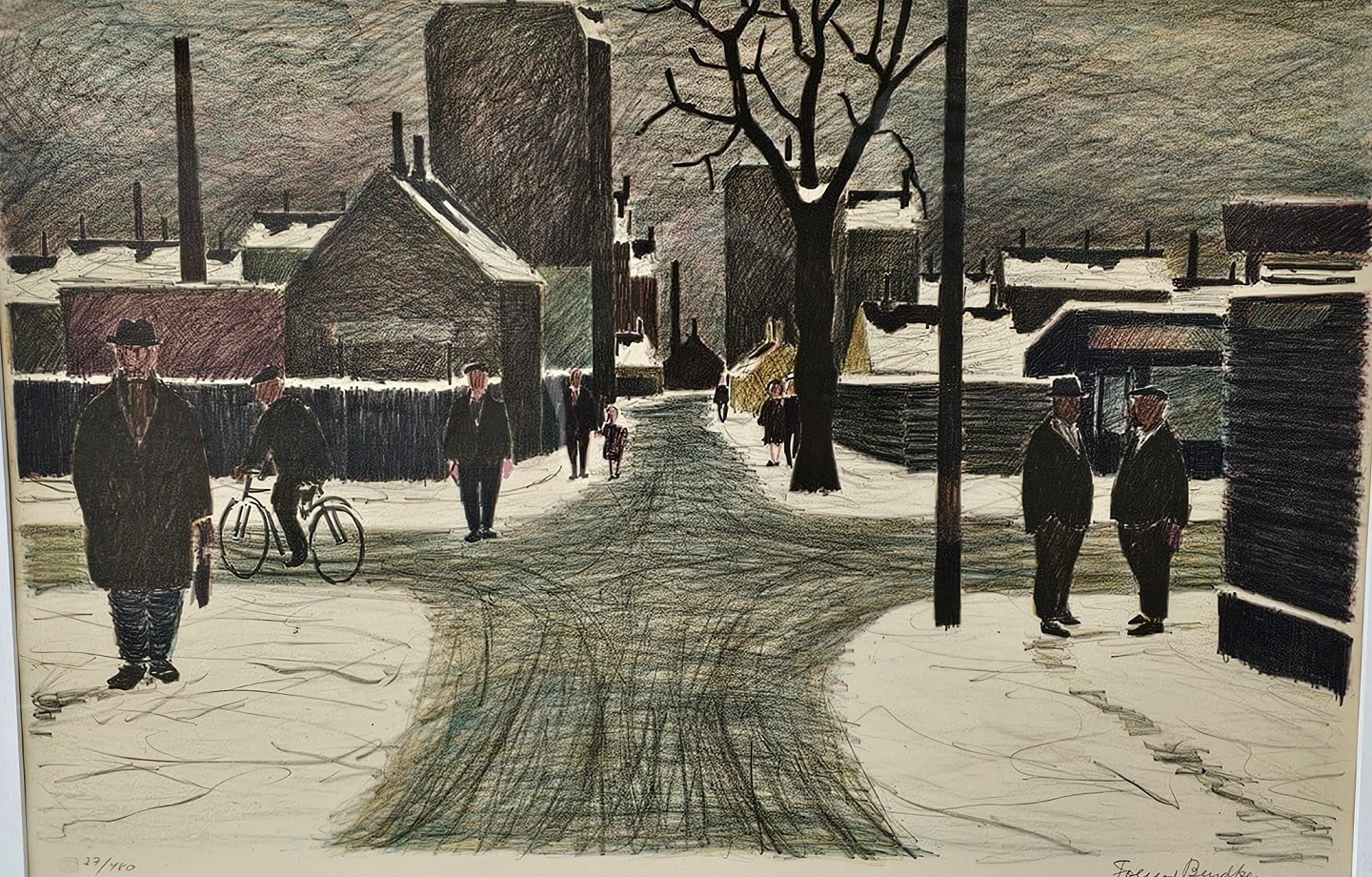 Litografi på papir med motiv af mennesker i et gadekryds. Monteret i sortmalet trærammeNr. 37/480