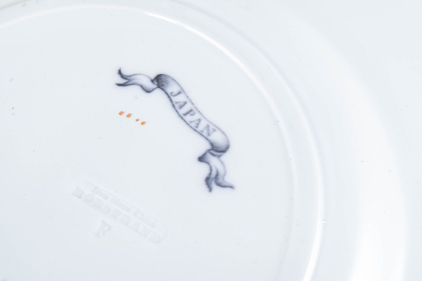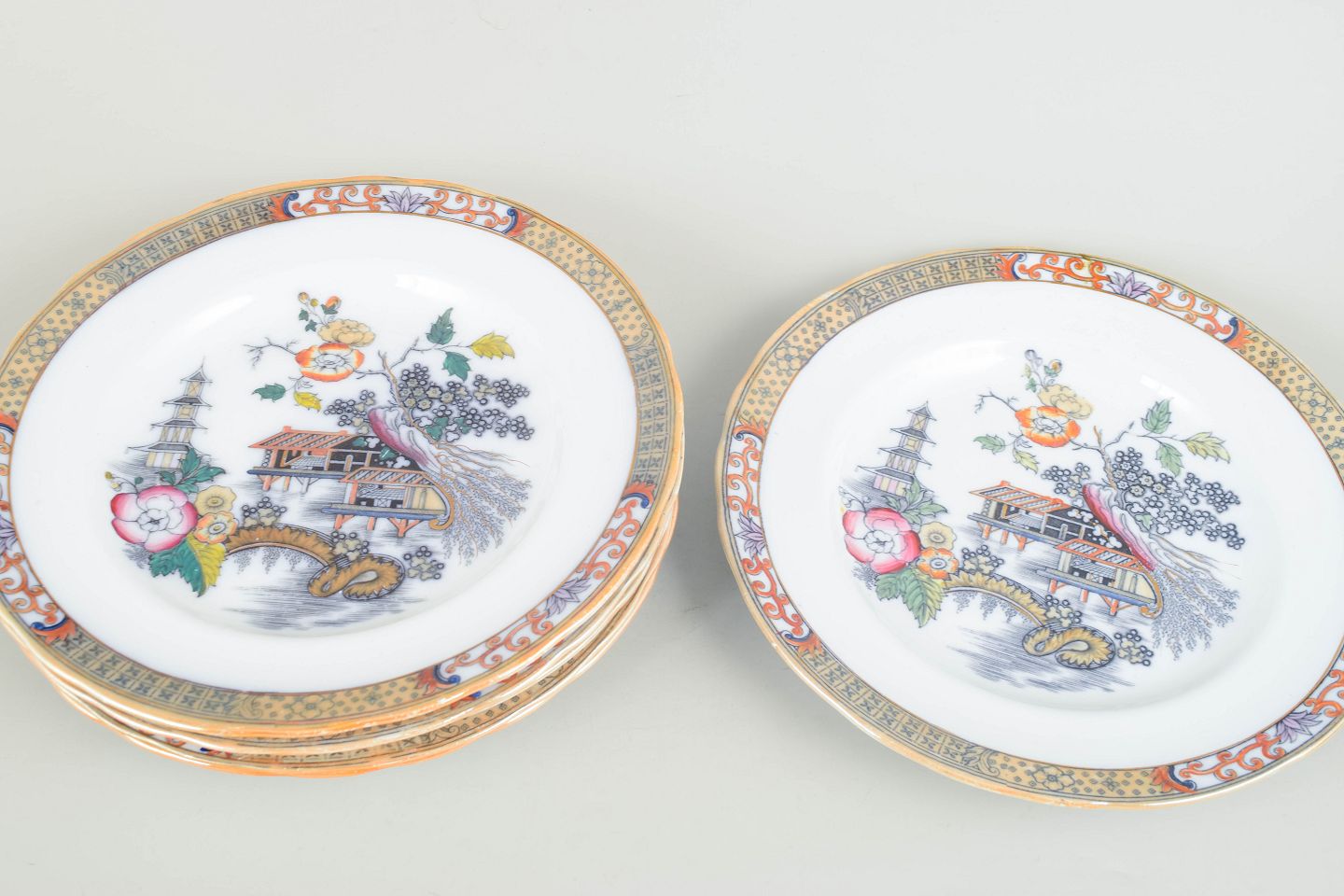 Rörstrand "Japan", sæt af seks middagstallerkener.Middagstallerkener i fajance med orientalsk inspireret dekoration i polykrome farver og detaljerig bemaling i japansk stil, karakteristisk for Rörstrands japanismeproduktion fra begyndelsen af 1900-tallet.