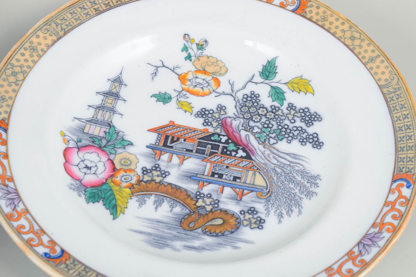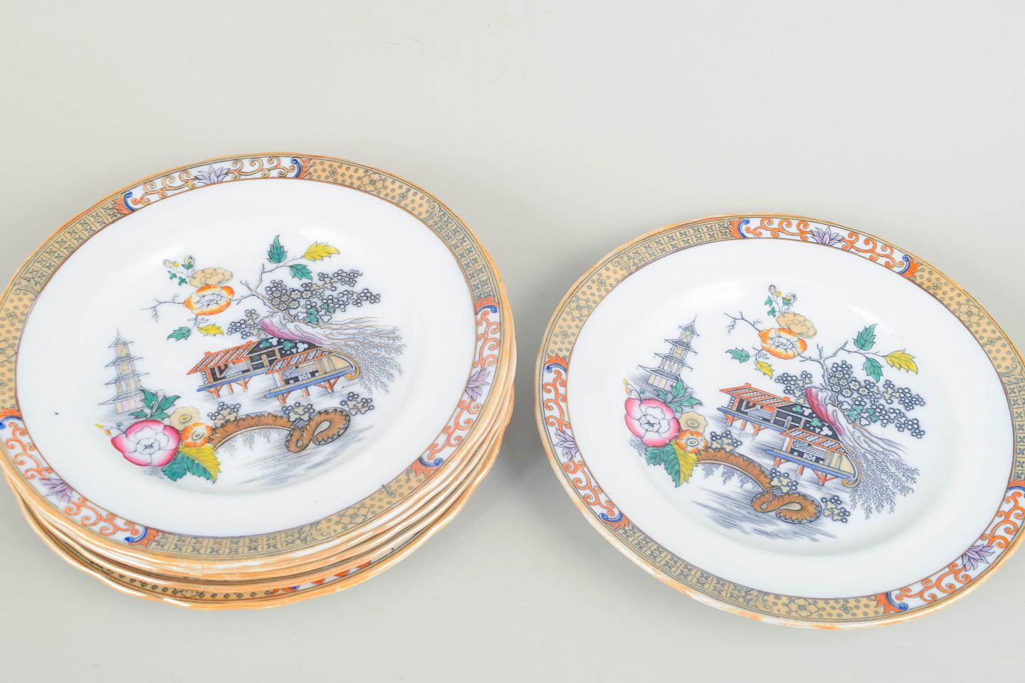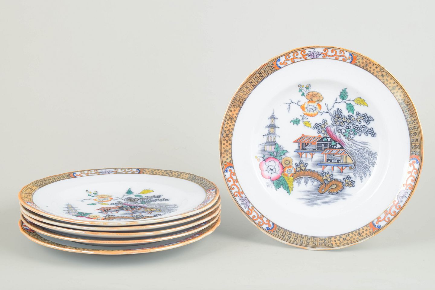 Rörstrand "Japan", sæt af seks middagstallerkener.Middagstallerkener i fajance med orientalsk inspireret dekoration i polykrome farver og detaljerig bemaling i japansk stil, karakteristisk for Rörstrands japanismeproduktion fra begyndelsen af 1900-tallet.