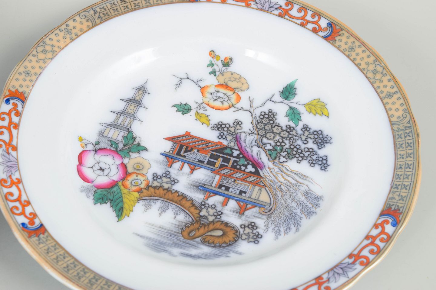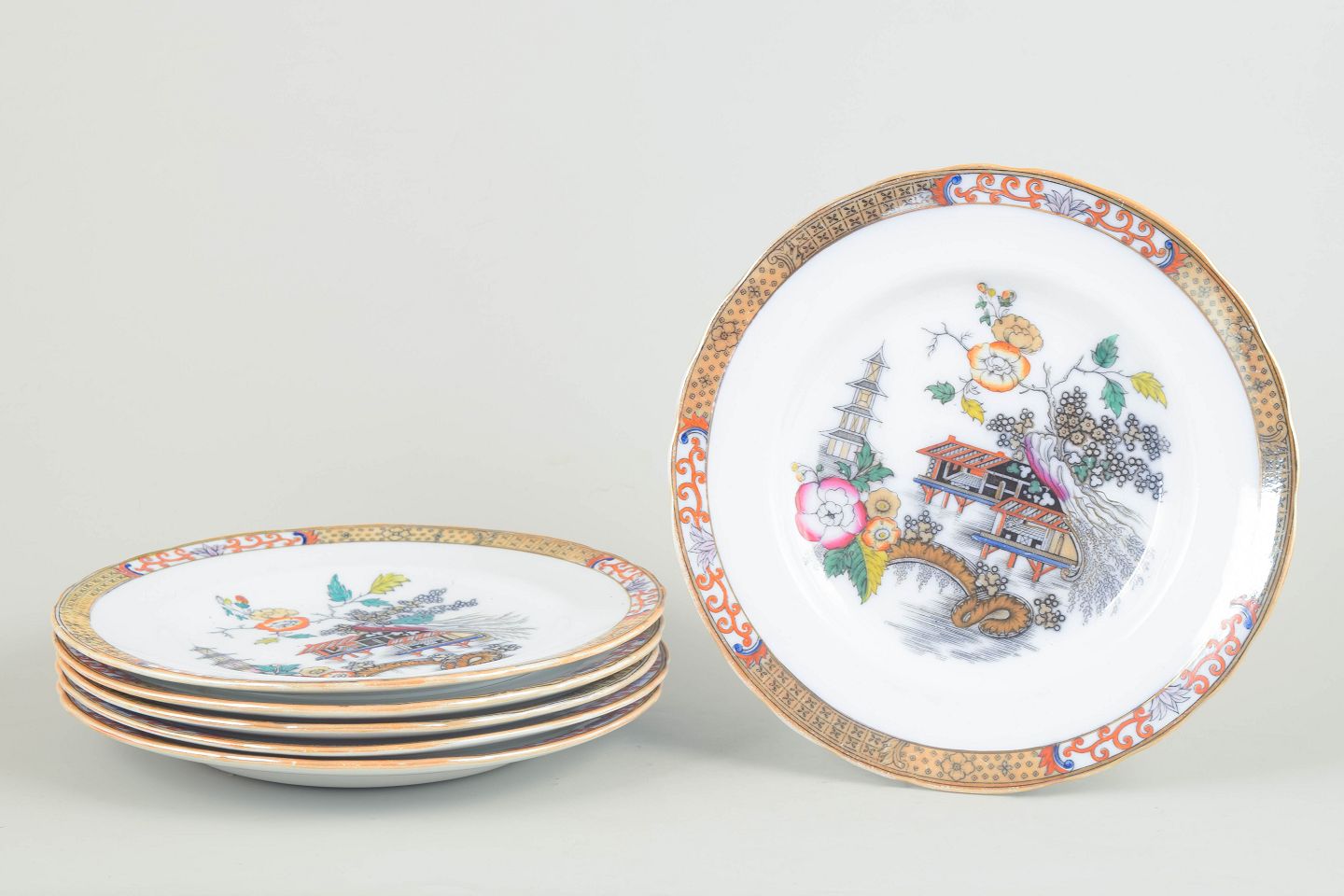 Rörstrand "Japan", sæt af seks middagstallerkener.Middagstallerkener i fajance med orientalsk inspireret dekoration i polykrome farver og detaljerig bemaling i japansk stil, karakteristisk for Rörstrands japanismeproduktion fra begyndelsen af 1900-tallet.