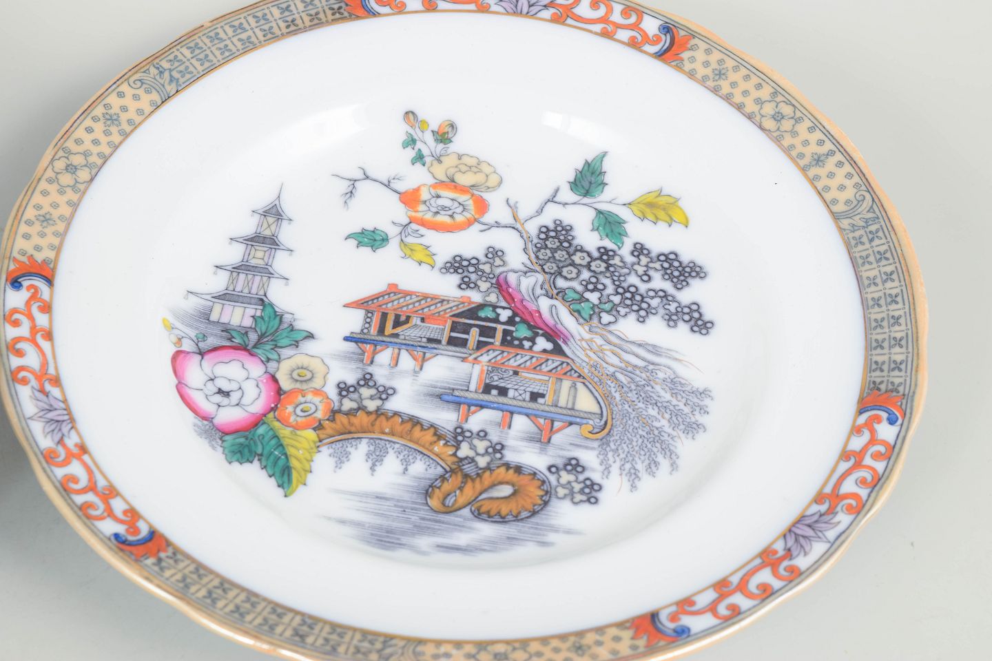 Rörstrand "Japan", sæt af seks middagstallerkener.Middagstallerkener i fajance med orientalsk inspireret dekoration i polykrome farver og detaljerig bemaling i japansk stil, karakteristisk for Rörstrands japanismeproduktion fra begyndelsen af 1900-tallet.